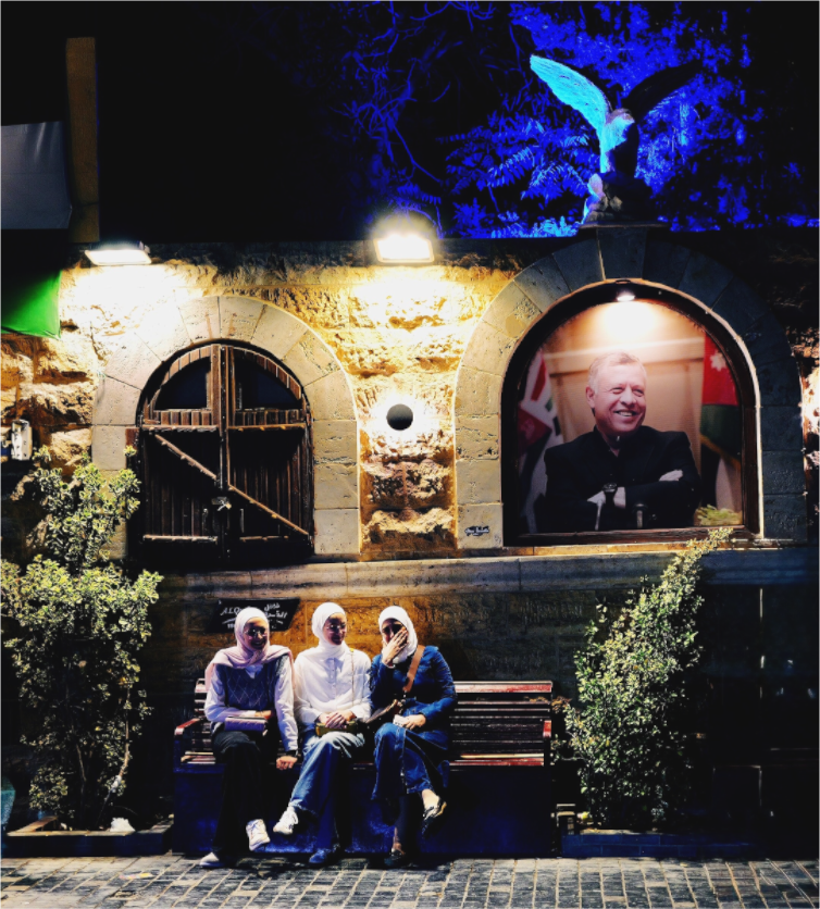 On the streets of Amman, the image of King Abdullah II looms as a familiar and constant presence. Here, in the heart of the city, his luminous portrait overlooks a stone bench where three young women laugh beneath a lamppost. This ordinary scene embodies a snapshot of contemporary Jordan, where monarchical tradition coexists with a free, cultured, and connected urban youth.
