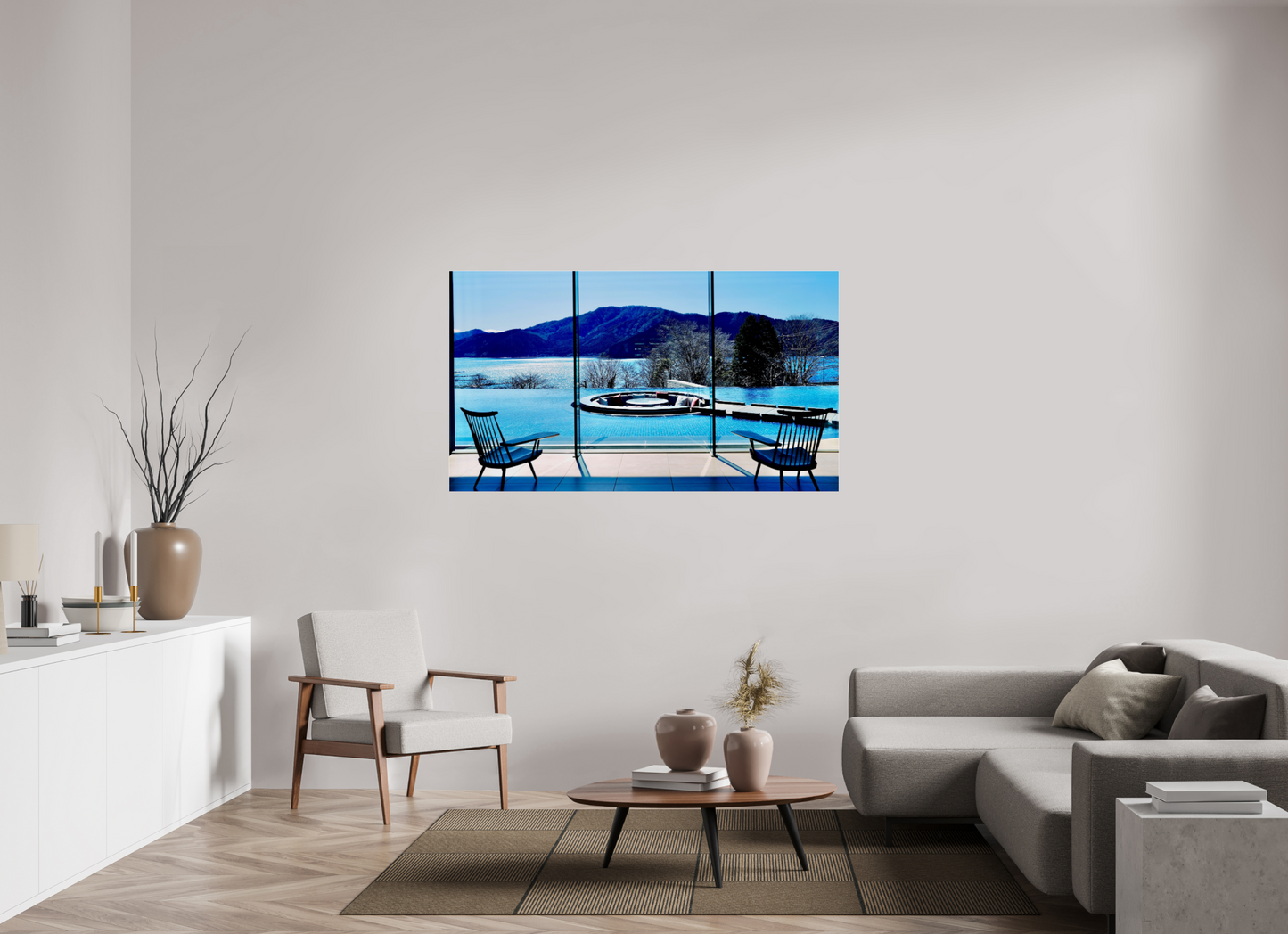 In Hakone , this contemporary inn reinterprets elements of traditional Japanese architecture : a circular lounge, embedded like a horigotatsu , floats in the heart of an infinity pool that visually extends into Lake Ashi . The seats encircle a central fireplace, a modern echo of the irori , the family hearth around which domestic life took place. The circle, a symbol of harmony in Japanese culture, here interacts with the pure lines of the design and the surrounding volcanic nature. In the background, Lake Ashi , born from an eruption 3,000 years ago, remains a sacred Shinto site and an iconic place to observe Mount Fuji .
