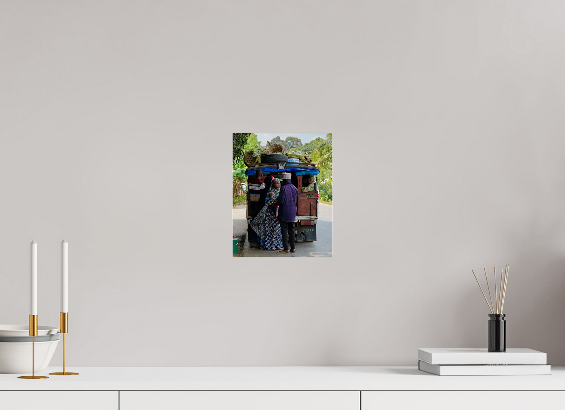 In Zanzibar , dala-dala – Tanzania's typical shared minibuses – provide a link between rural areas and urban centers . Here, vehicle No. 601 is overloaded with sugarcane , wicker baskets , and passengers. These traditional collective transport vehicles are essential for local economic exchanges , allowing farmers to reach the markets of Stone Town . The rooftop loading tells of efficient and resilient peasant logistics, while the often cramped interior space becomes a place of social life , discussion, and mutual aid between villagers. This scene documents a daily mobility in East Africa that is little visible but crucial for island survival.