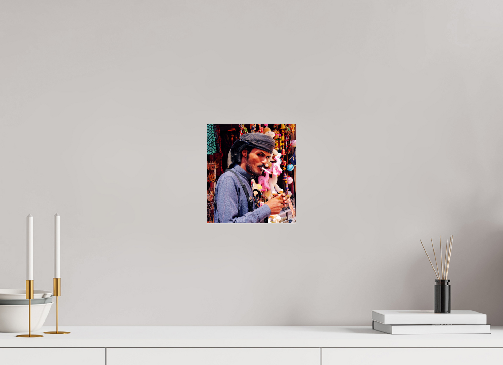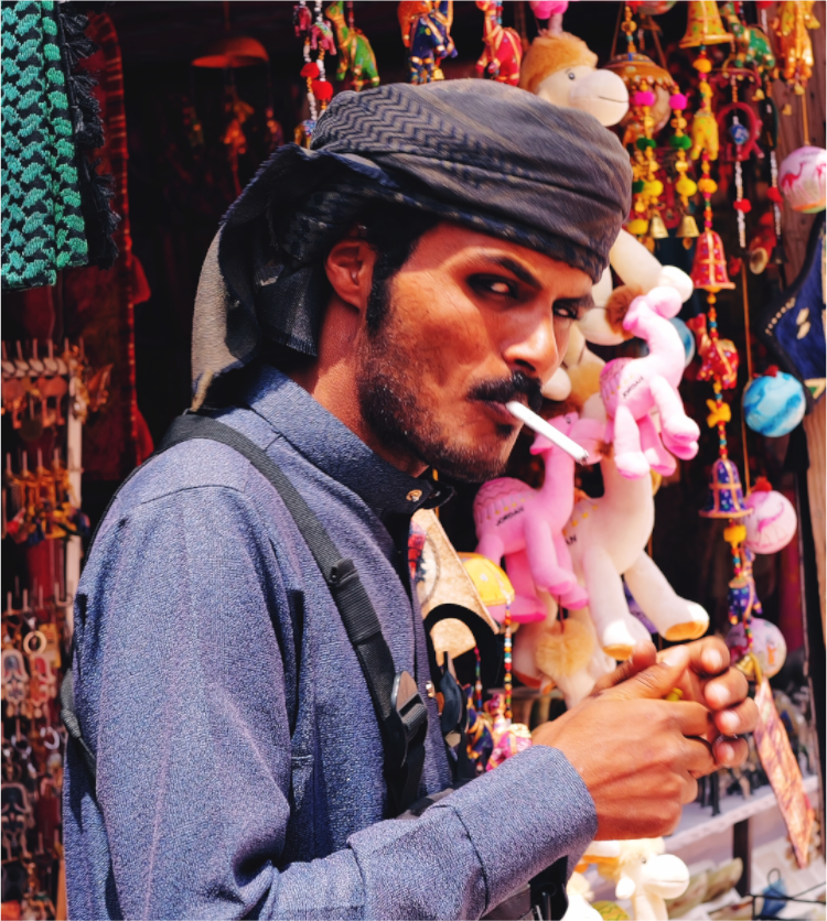 In the shopping streets of Petra , a young man smokes a cigarette in front of his shop. His dark keffiyeh and direct gaze contrast with the pink plush toys and souvenirs hanging behind him. A seemingly innocuous scene, in a setting that has become familiar to visitors.