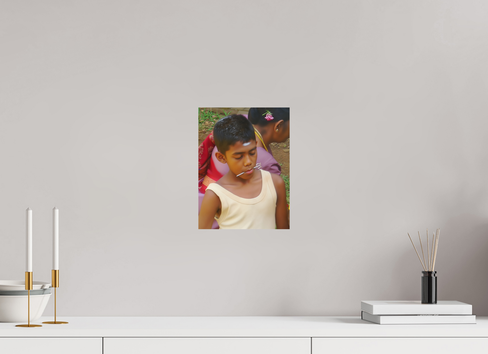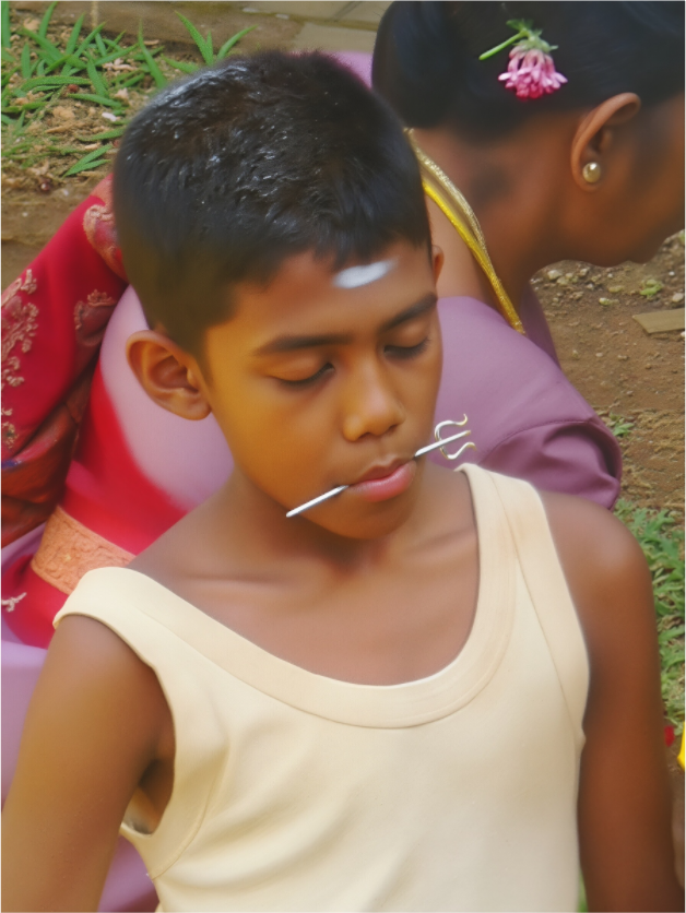 During the Thaipusam Kavadi celebrated at the Valley of the Priests , near Port Louis , Hindu worshippers undergo a test of faith in honor of the god Murugan . In this photo taken in Mauritius, a young boy participates in the ritual procession, his cheeks pierced by a vel , a symbol of purification and silent offering. This ancient Tamil ritual marks the end of a period of fasting, prayer, and abstinence, and culminates at the Kaylasson Temple , an emblematic sanctuary of the Mauritian Tamil community. The piercings, carried out in a state of trance, testify to an embodied spirituality, where pain becomes prayer, and the body, a channel of devotion.