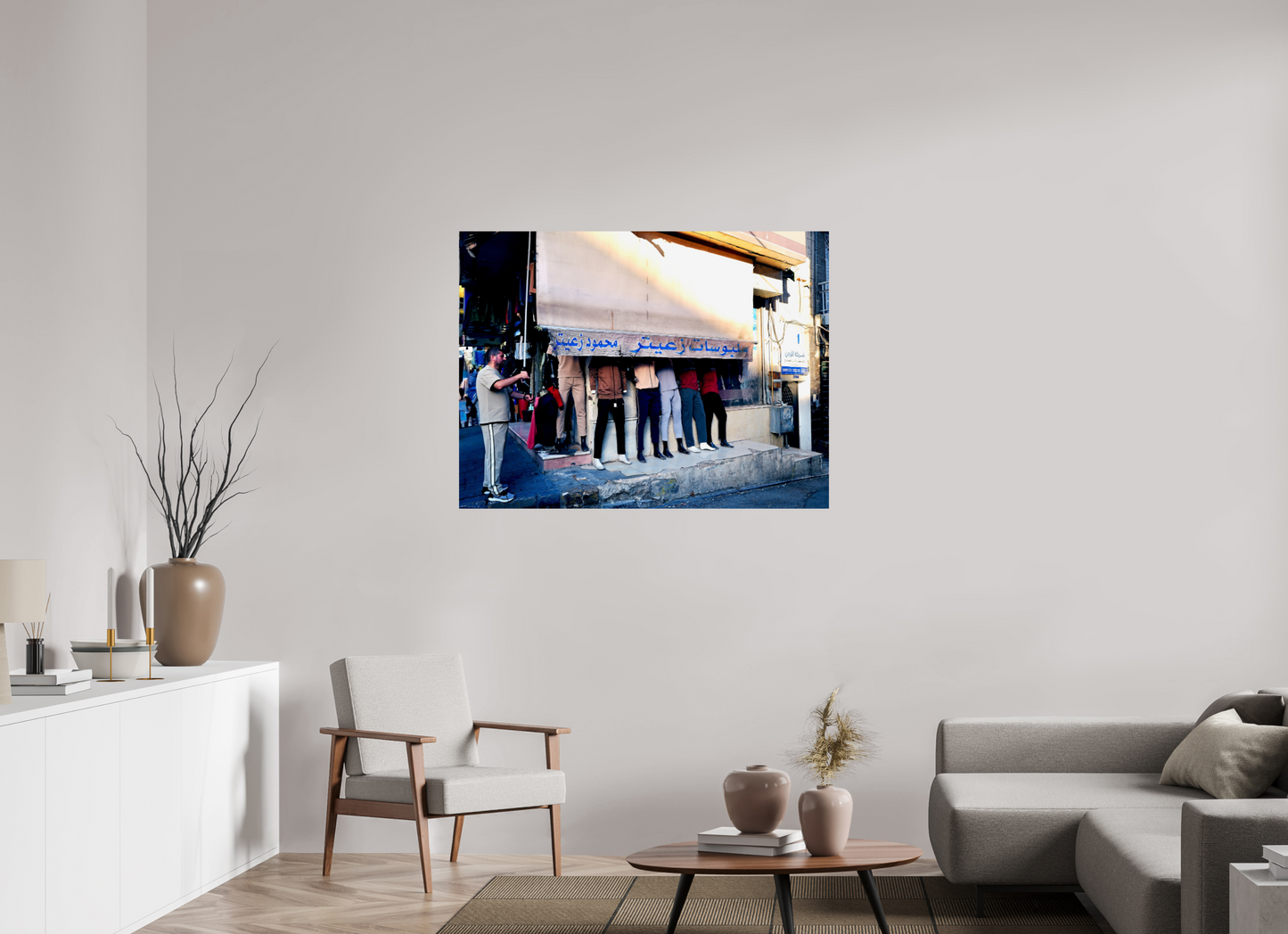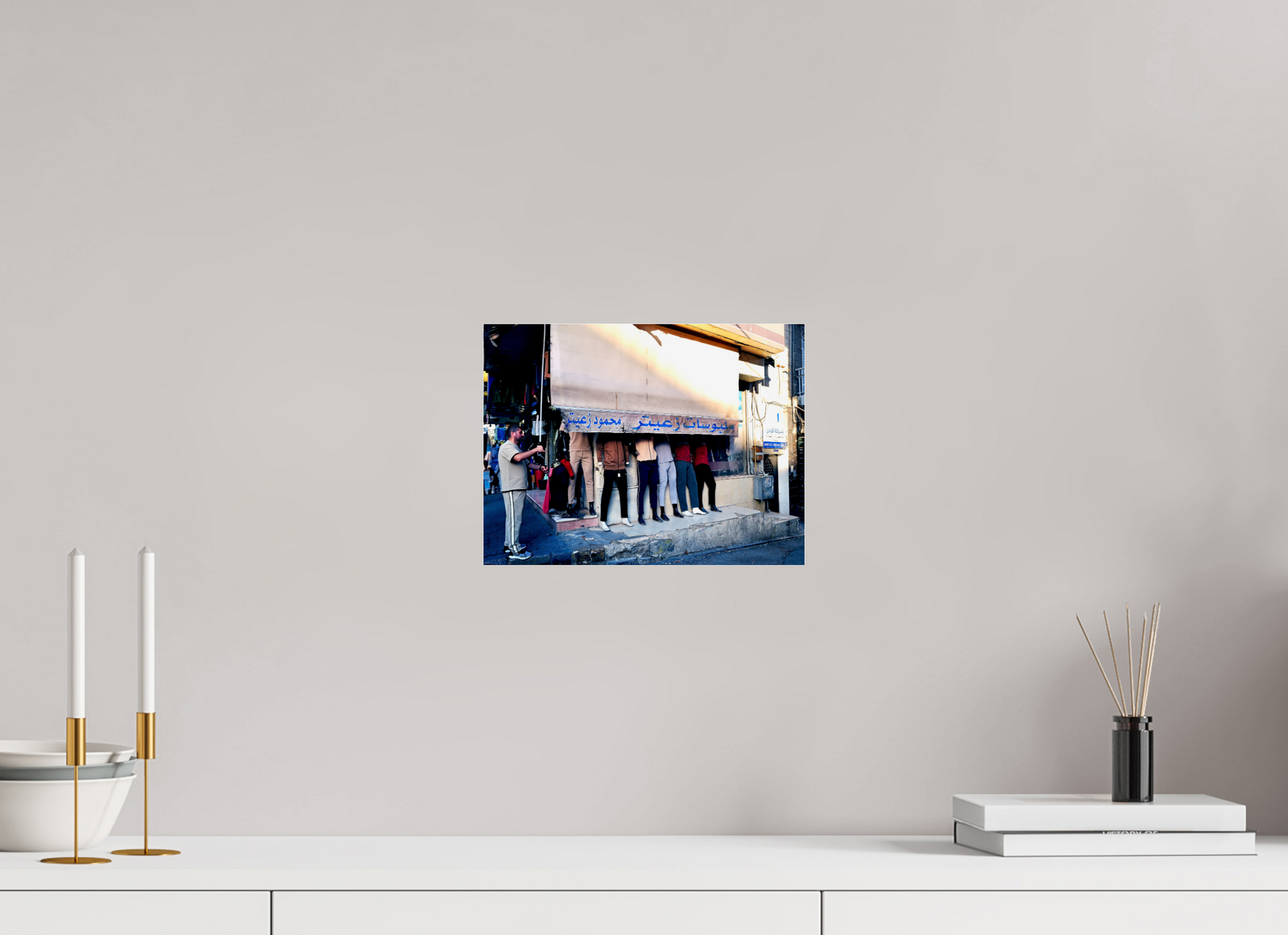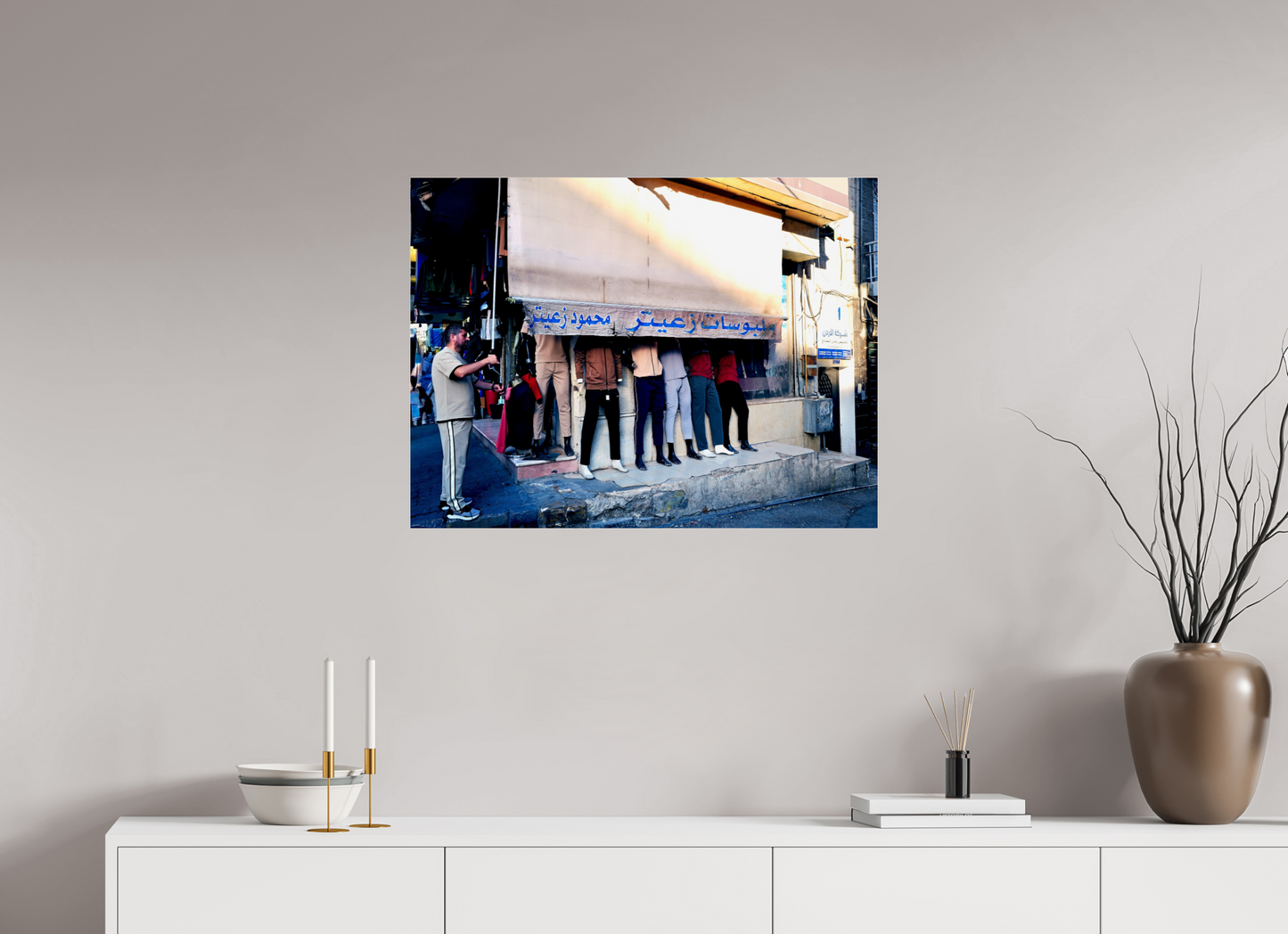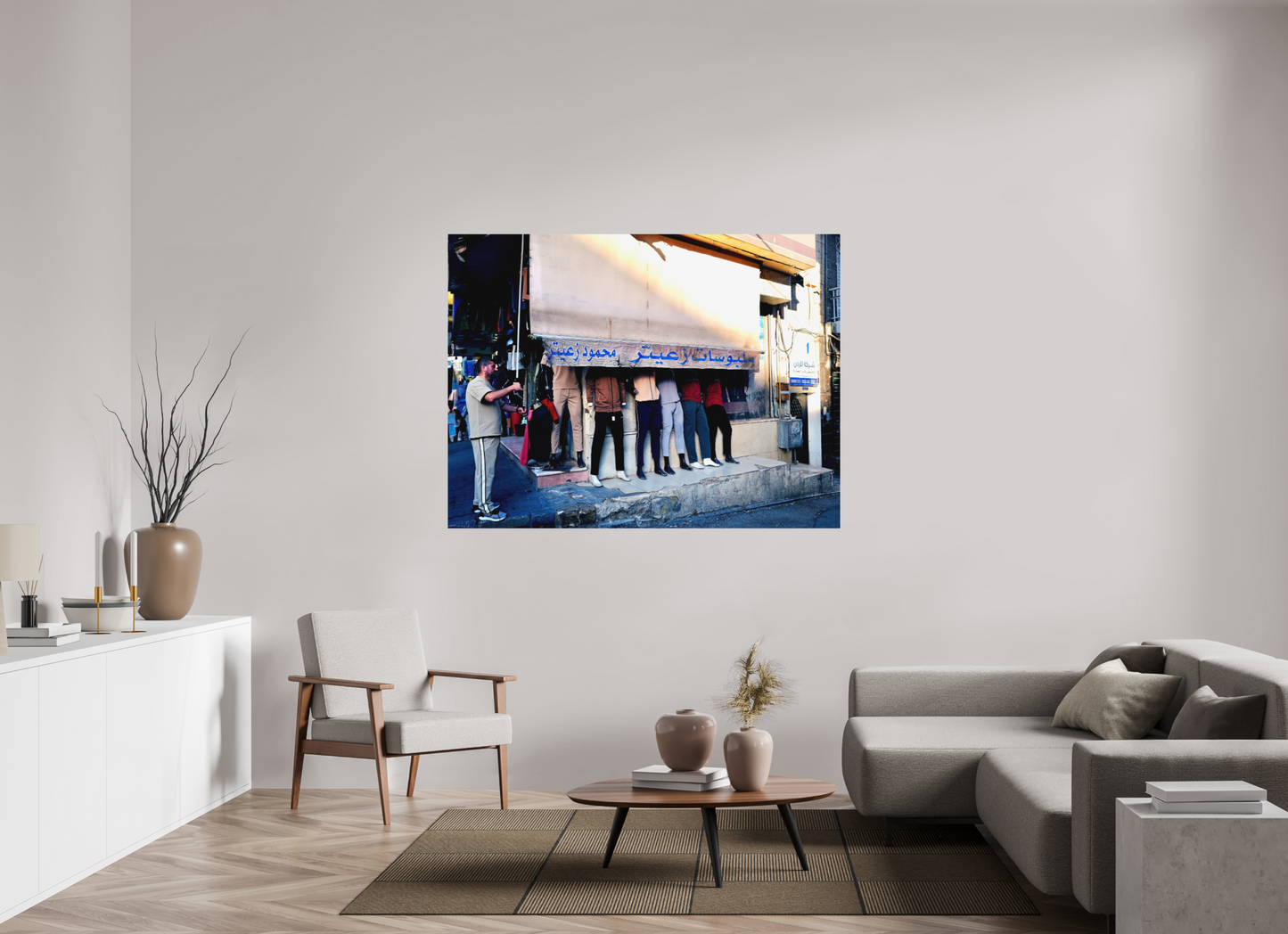 Every morning in Amman, the same ritual takes place: the curtain rises on a day of sales. Here, it's literal. The merchant raises the canvas awning , gradually revealing his line of mannequins. This suspended moment creates an unintentionally burlesque scene, where the torsos remain camouflaged, as if they were not yet "ready to sell."