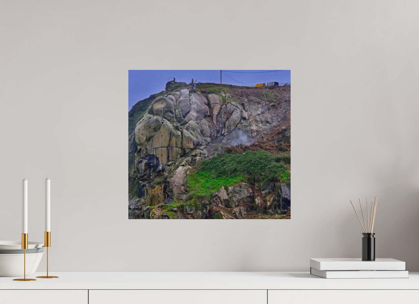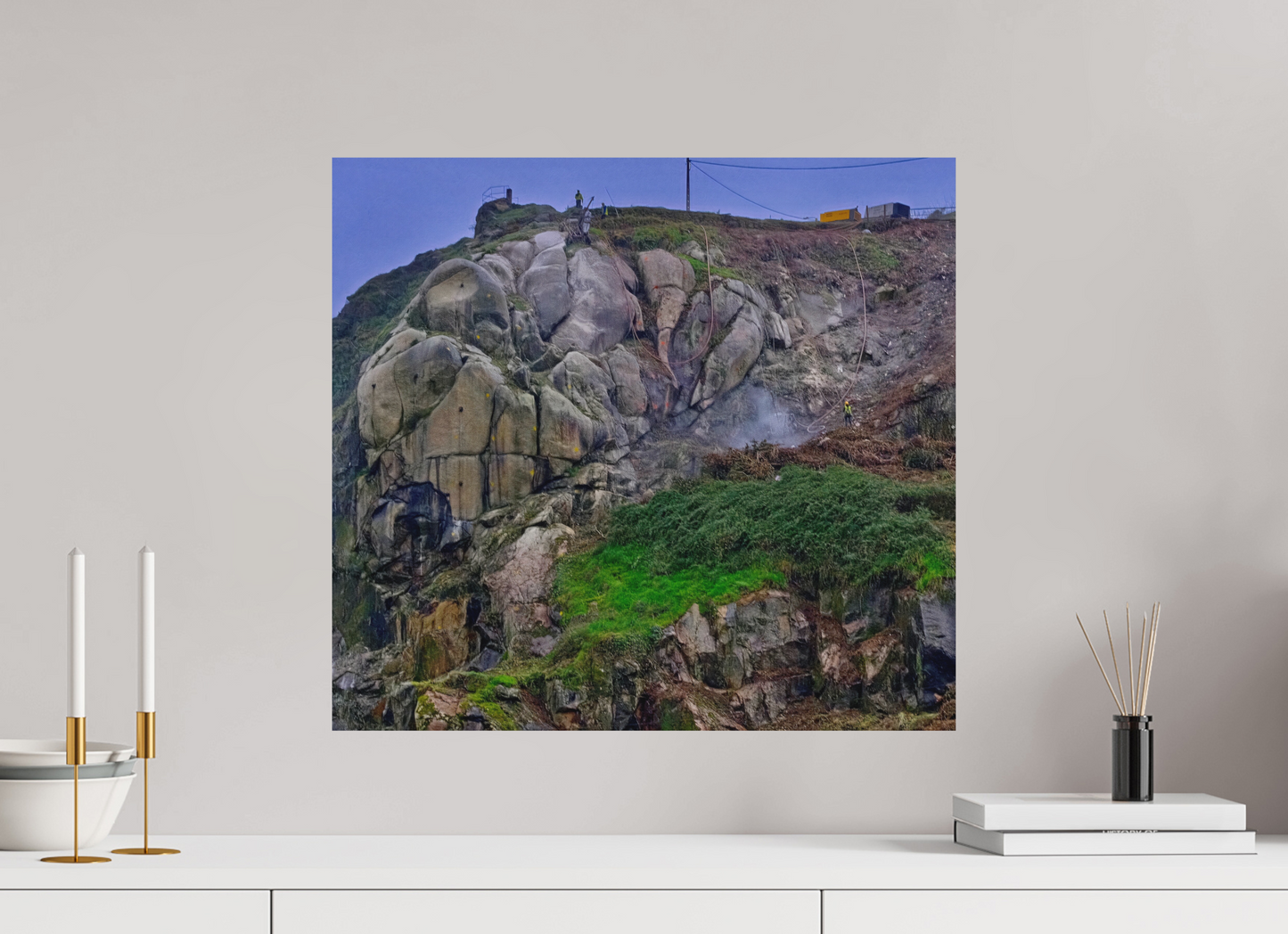 The anchor points are marked by colored markers directly on the rock. This operation is part of a rock slope stabilization process, commonly deployed in steep urban environments . This type of project mobilizes geologists , rope access technicians and geotechnical engineers to prevent rock falls that could endanger the roads or homes below.