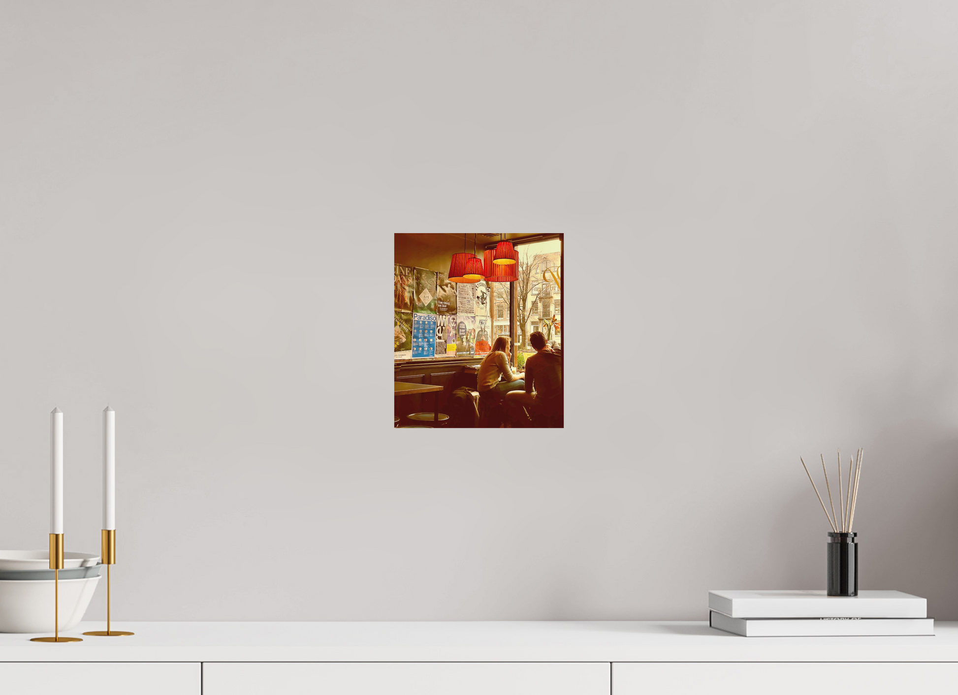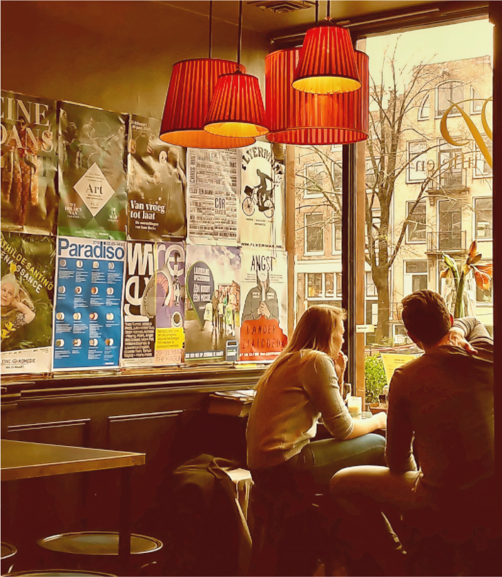 In Amsterdam's Jordaan district, a conversation suspends time. Behind the window of a canalside café, two figures lean toward each other, hidden from view. Around them, concert posters, cultural flyers, and red lamps create a subdued atmosphere, somewhere between artistic excitement and urban intimacy.