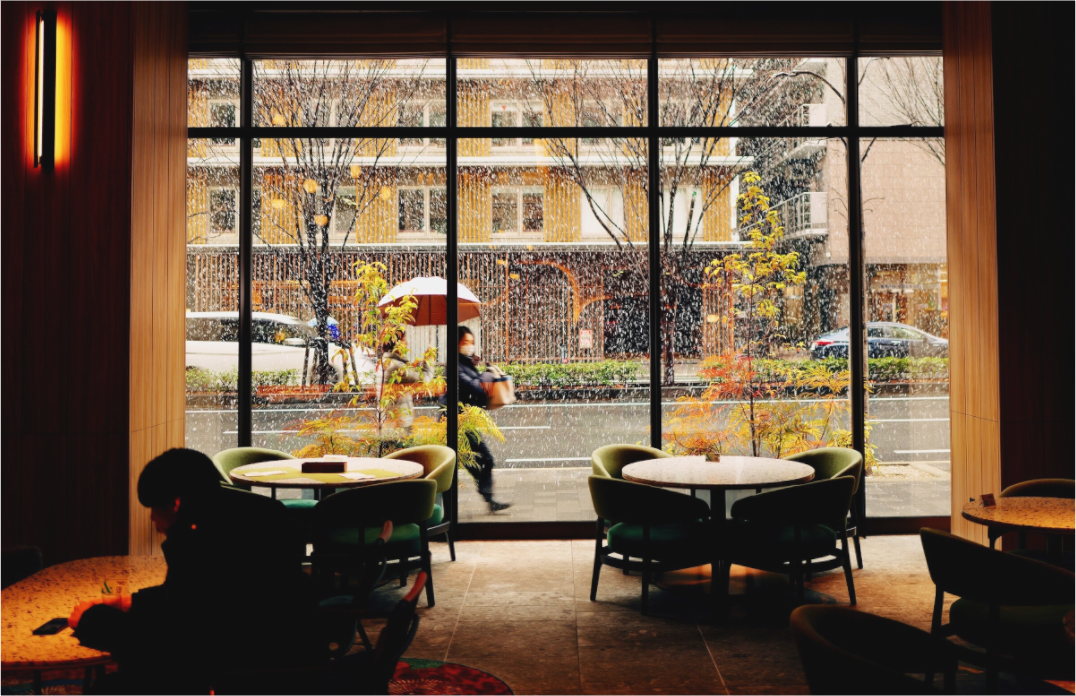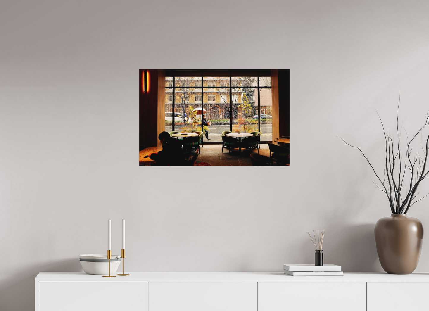 This photograph captures a rare form of what the Japanese call 「幽玄」yūgen —a discreet, intangible beauty, a mystery that does not seek to be solved. The blur of the passerby behind the glass roof is not accidental: it is the expression of a porous time , on the border between inside and outside, heat and cold, stillness and movement.