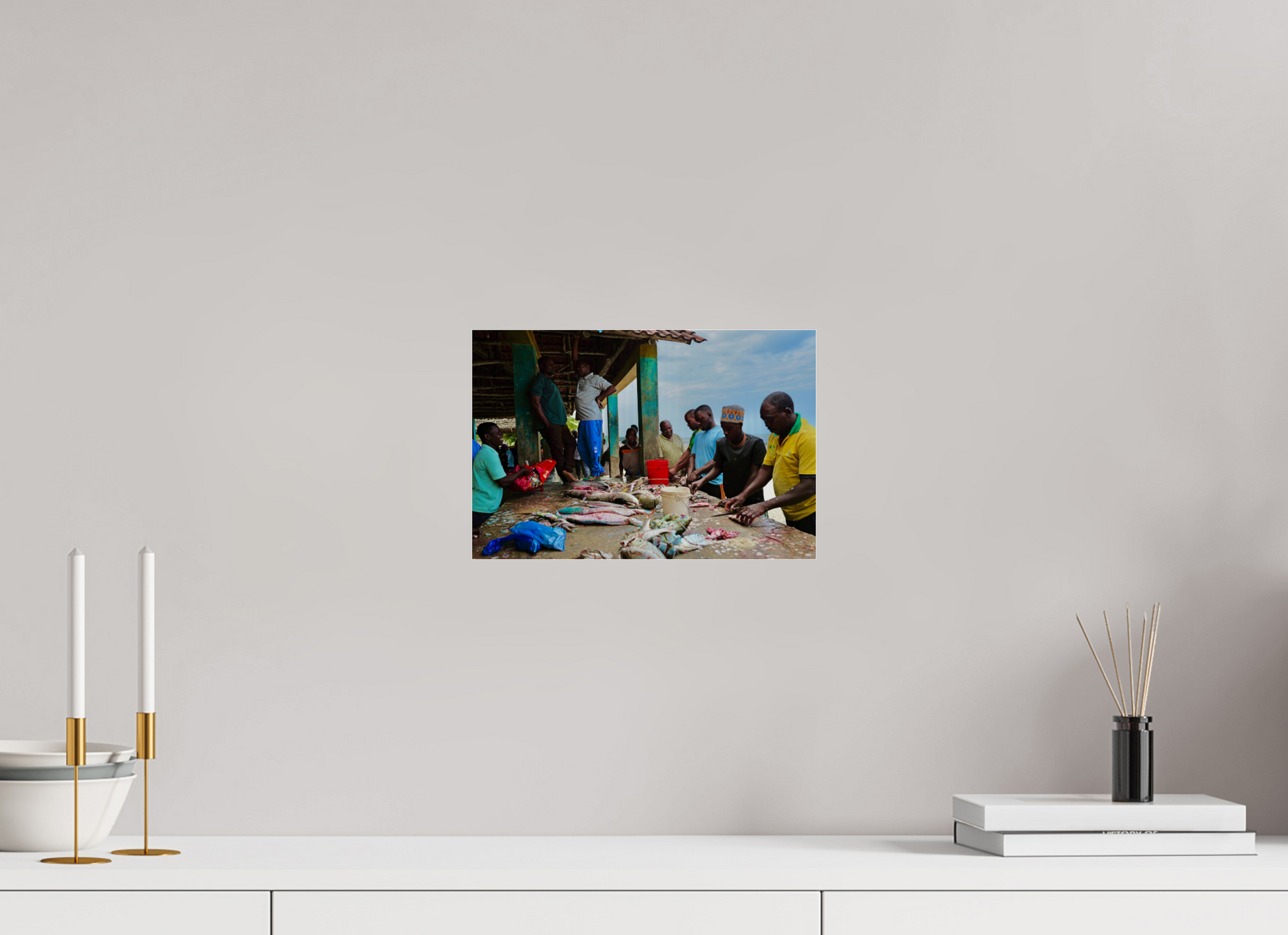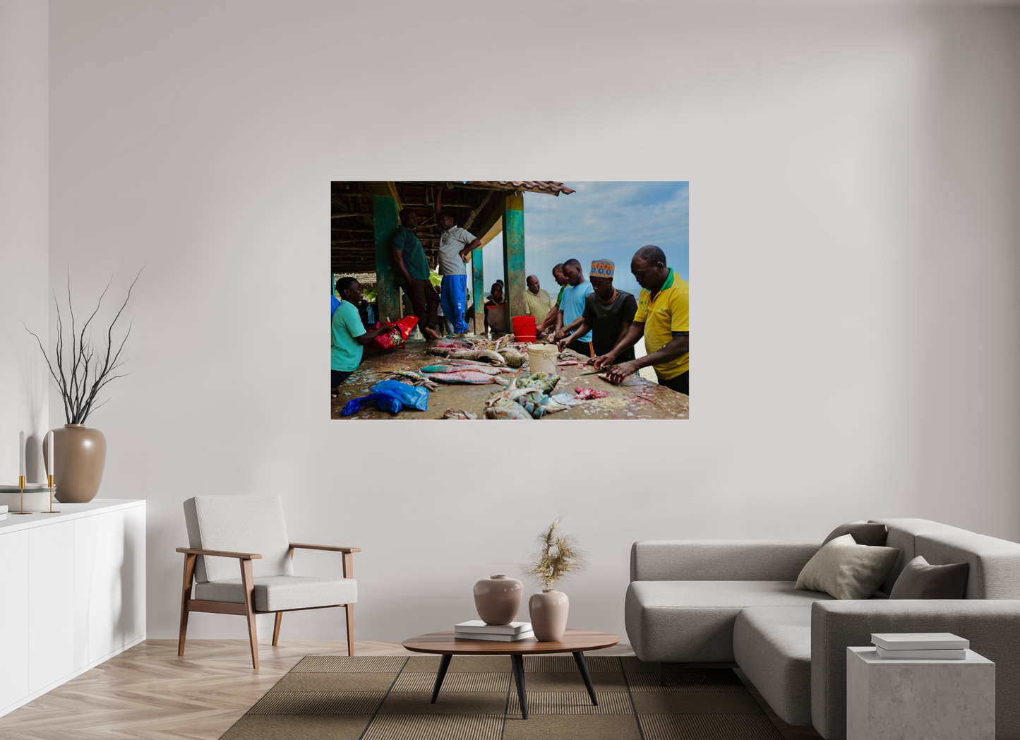 In Zanzibar , under a makeshift shelter by the ocean, hands bustle tirelessly around the artisanal fish market . Fishermen cut up the day's catch— moray eels, parrotfish, snappers —in a ballet of rapid movements, passed down from generation to generation. The roughly cemented cutting tables become the epicenter of a coastal fish market where both merchandise and the day's news are exchanged. This place is more than a workspace: it is a community hub , anchored in Zanzibar's maritime rituals , where words circulate as freely as the fish. Hand-filleting , the absence of refrigeration, and direct sales at auction bear witness to a living know-how , shaped by the constraints of the climate and the coastline. A raw marine daily life, off the tourist trail, where the local economy follows the tides.