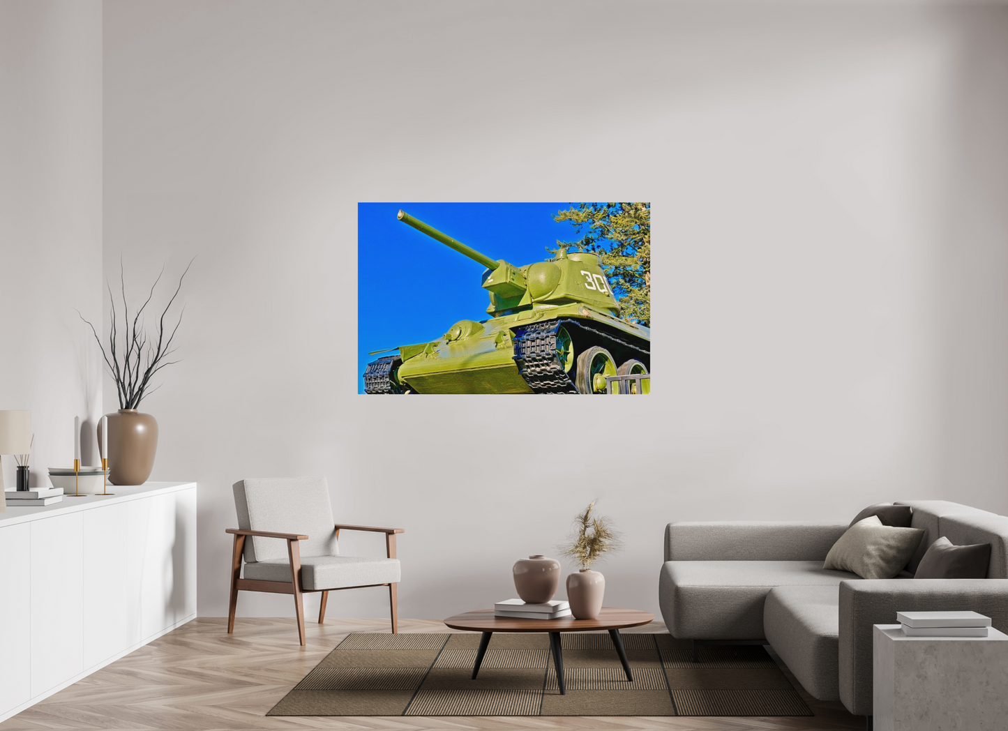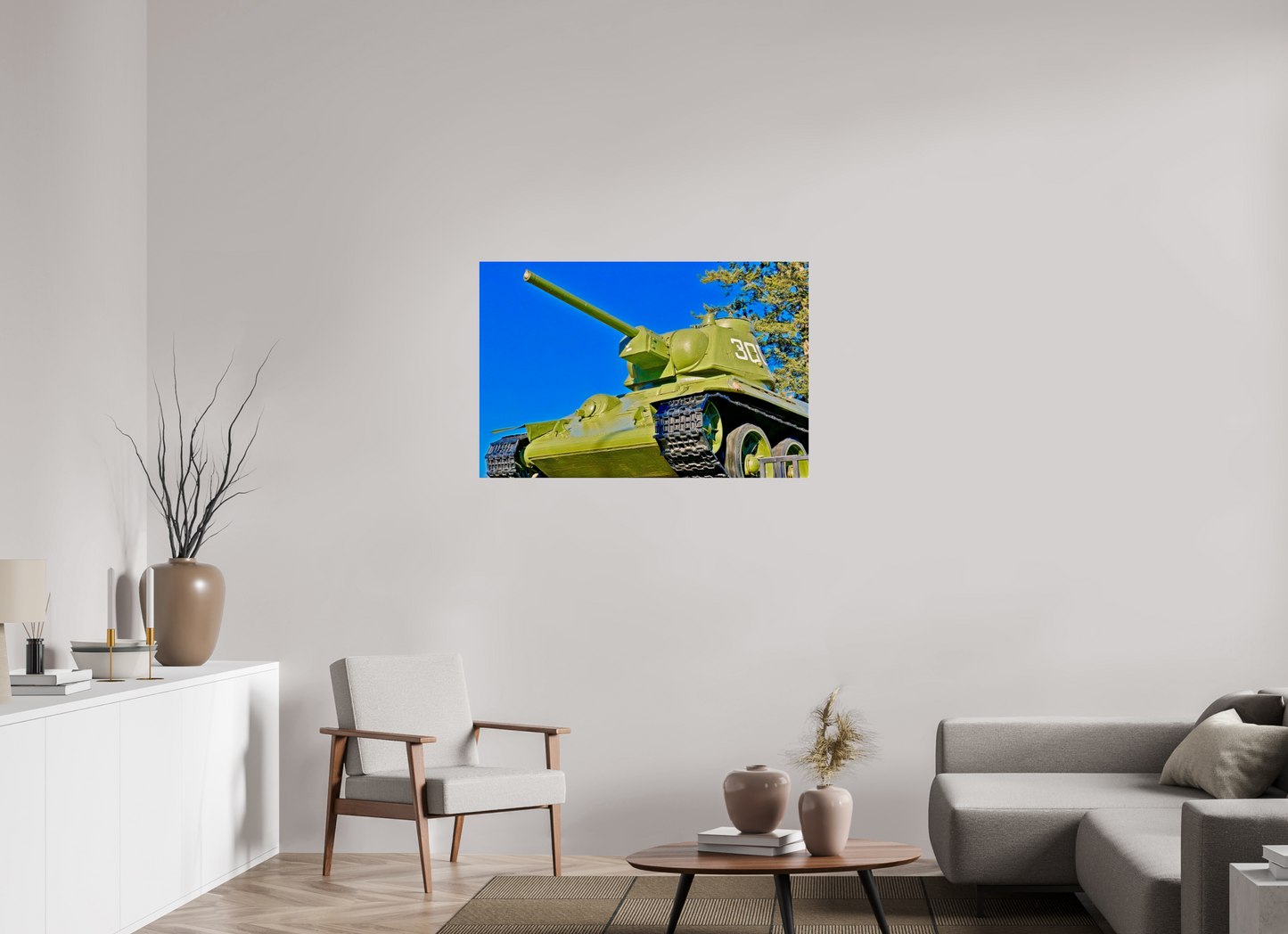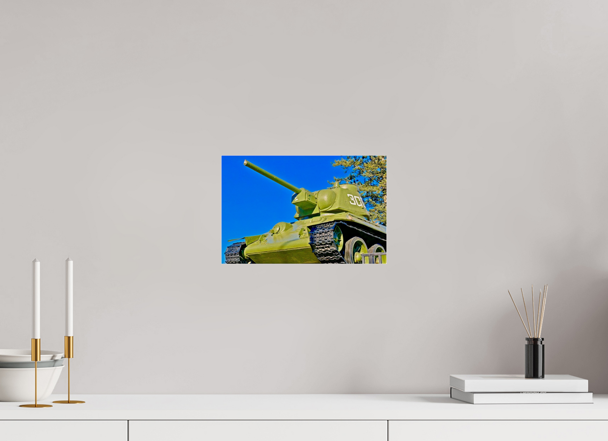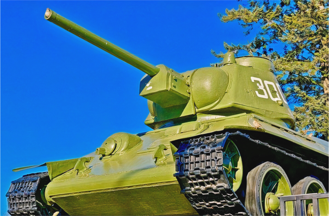 The tank depicted here is a Soviet T-34/76 , an iconic model of the Second World War, produced in over 57,000 units between 1940 and 1946. Deployed during the Battle of Berlin in 1945 , it symbolized the military power of the Red Army and the fall of the Third Reich. This specimen, exhibited at the entrance to the Soviet memorial in the Tiergarten , was one of the first armored vehicles to enter the German capital during the final capture.