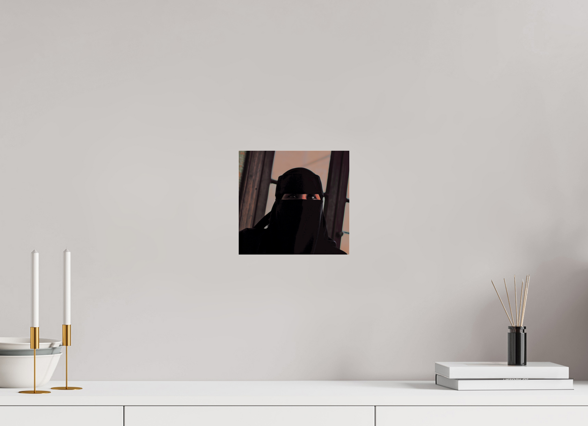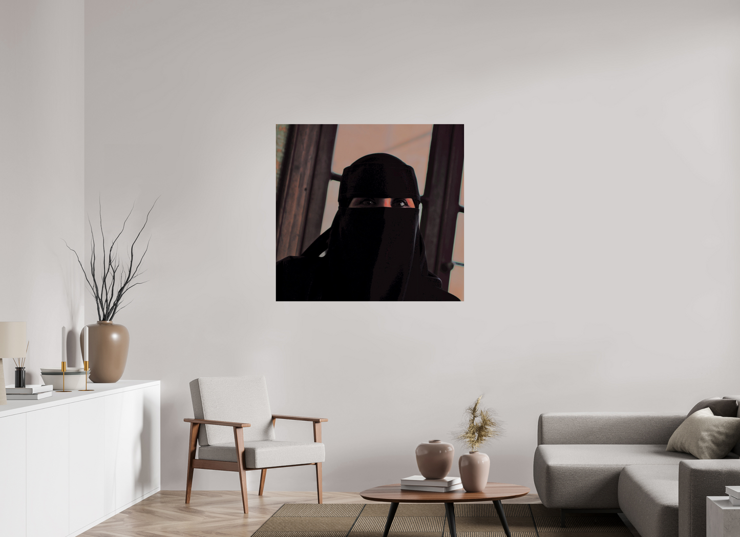 She wears a black niqab , covering her entire face except for her eyes, a personal and cultural choice distinct from anonymity. The sidelight reveals the textures of the fabric and the reflections in her eyes, captured through precise exposure without post-production artifice.