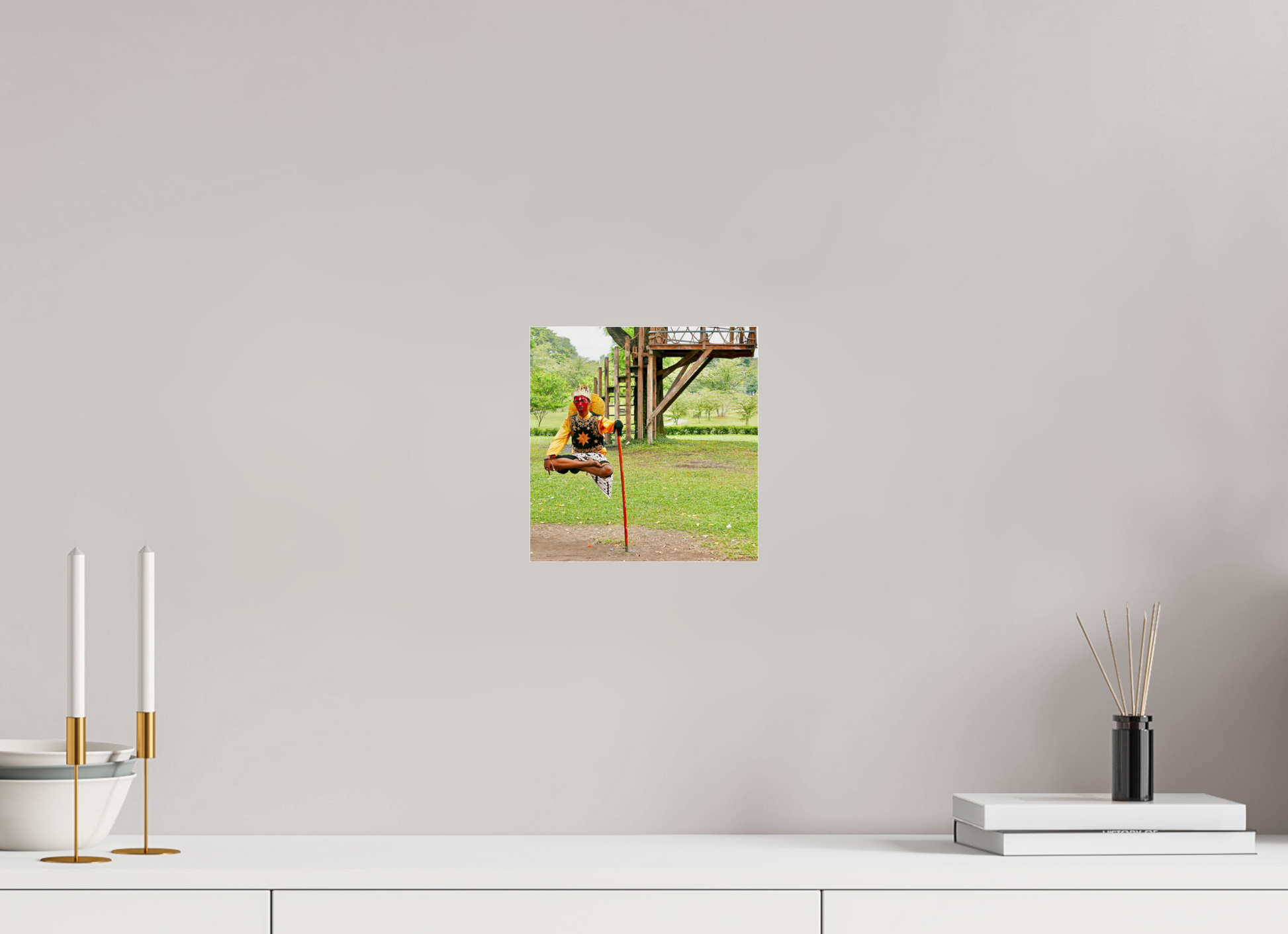 The scene shows a performer in apparent levitation , a popular practice in the streets of Southeast Asia , particularly in Indonesia . This type of performance relies on a hidden metal structure : a rigid seat integrated into the costume is attached to a central rod anchored to a stable base on the ground. The stick held by the performer , often colorful, is actually an extension of this structure, ensuring the overall stability of the whole.