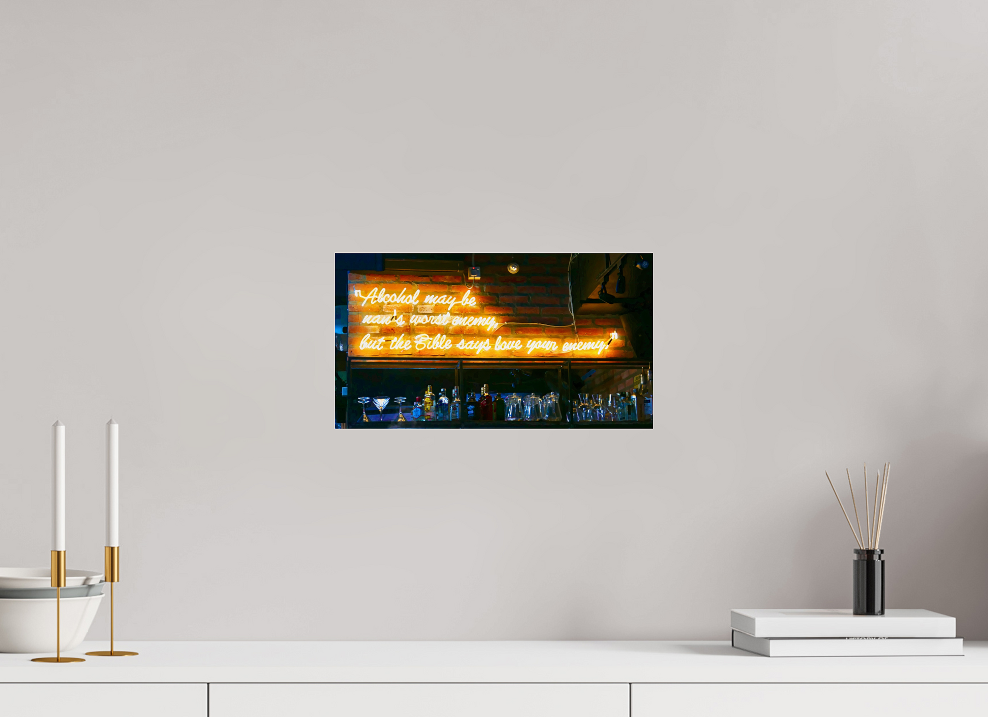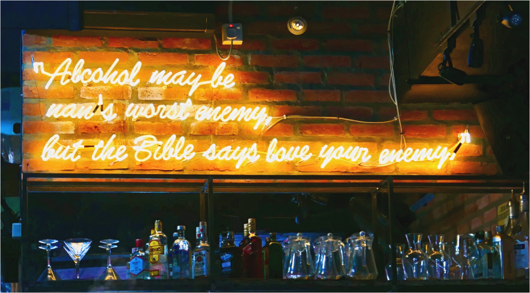 In Bali, bar walls now display luminous maxims that have become hallmarks of globalized humor . Here, the neon plays on a quote attributed to Frank Sinatra— "Alcohol may be a man's worst enemy, but the Bible says love your enemy" —transformed into a mantra of hedonistic consumption , at the intersection of sarcasm, religion, and Instagrammable decor.