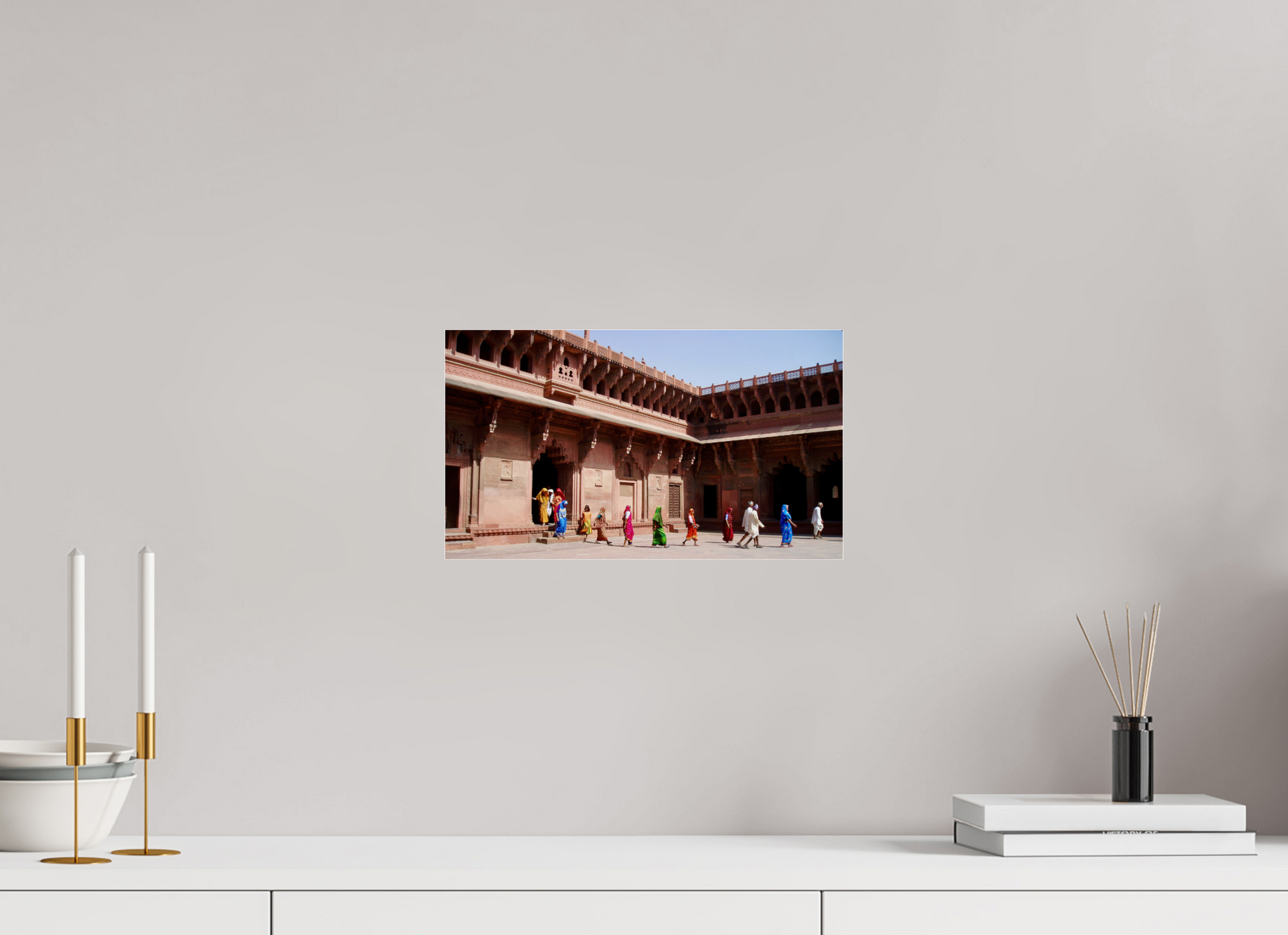 Their silhouettes, carried by the light of Rajasthan, echo the sculpted red sandstone pillars, emblematic of Mughal architecture. The walls, patinated by the centuries, become a canvas for this choreography of everyday life.