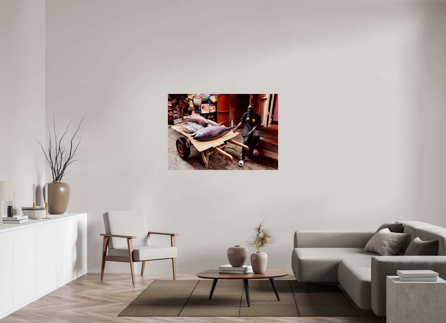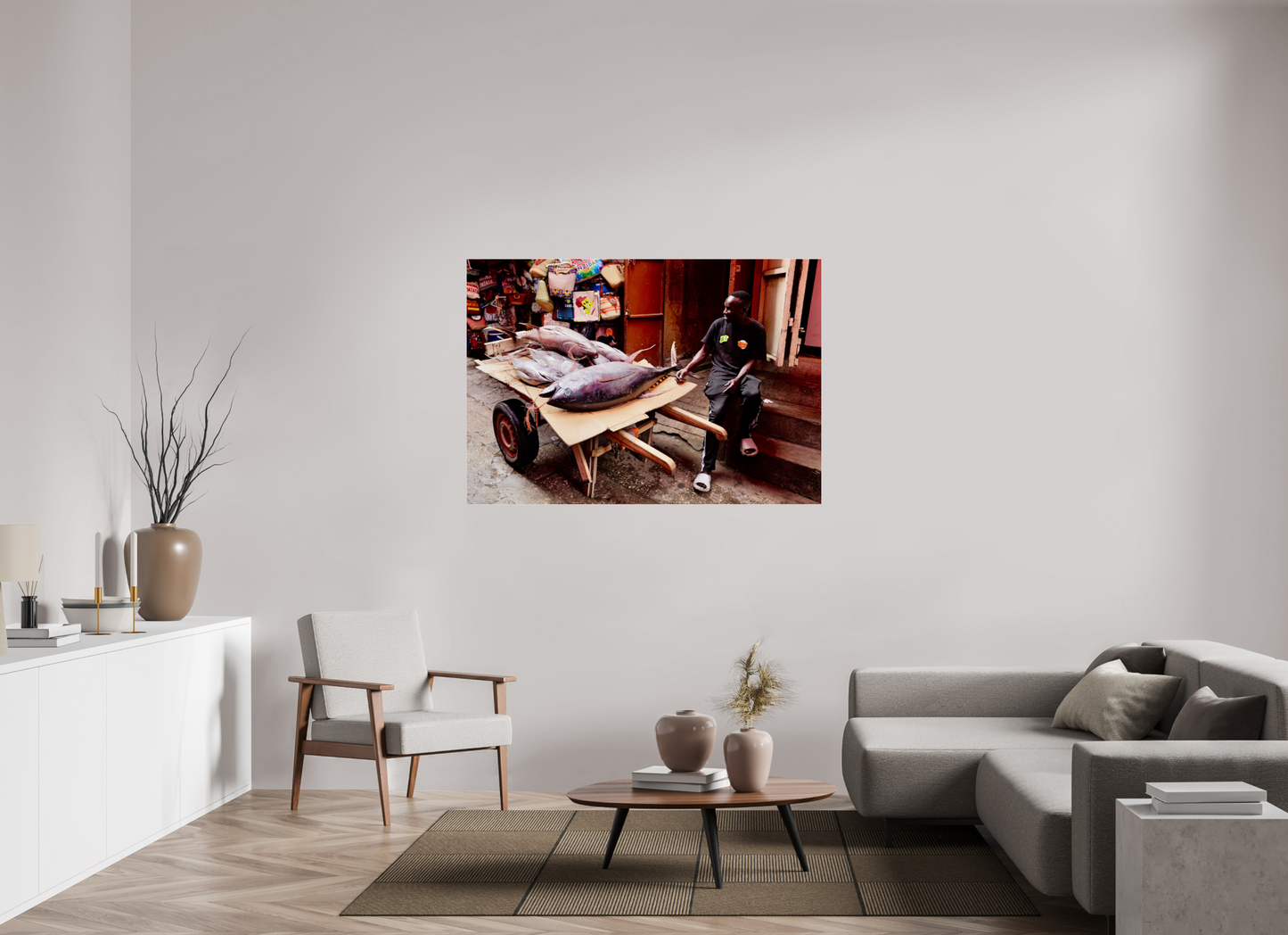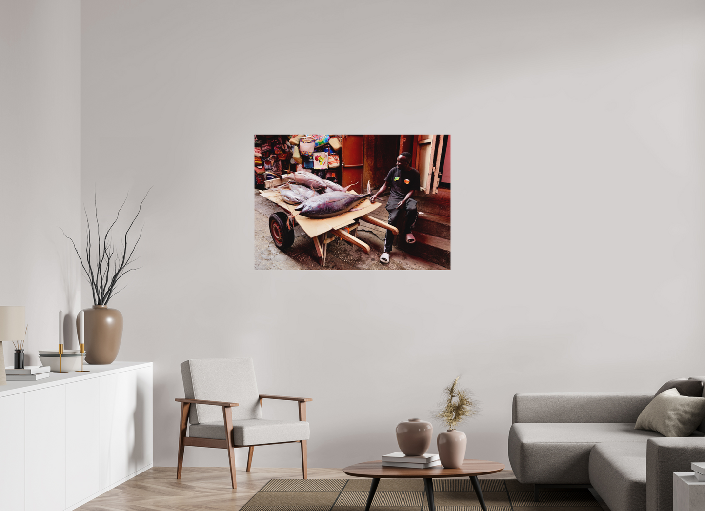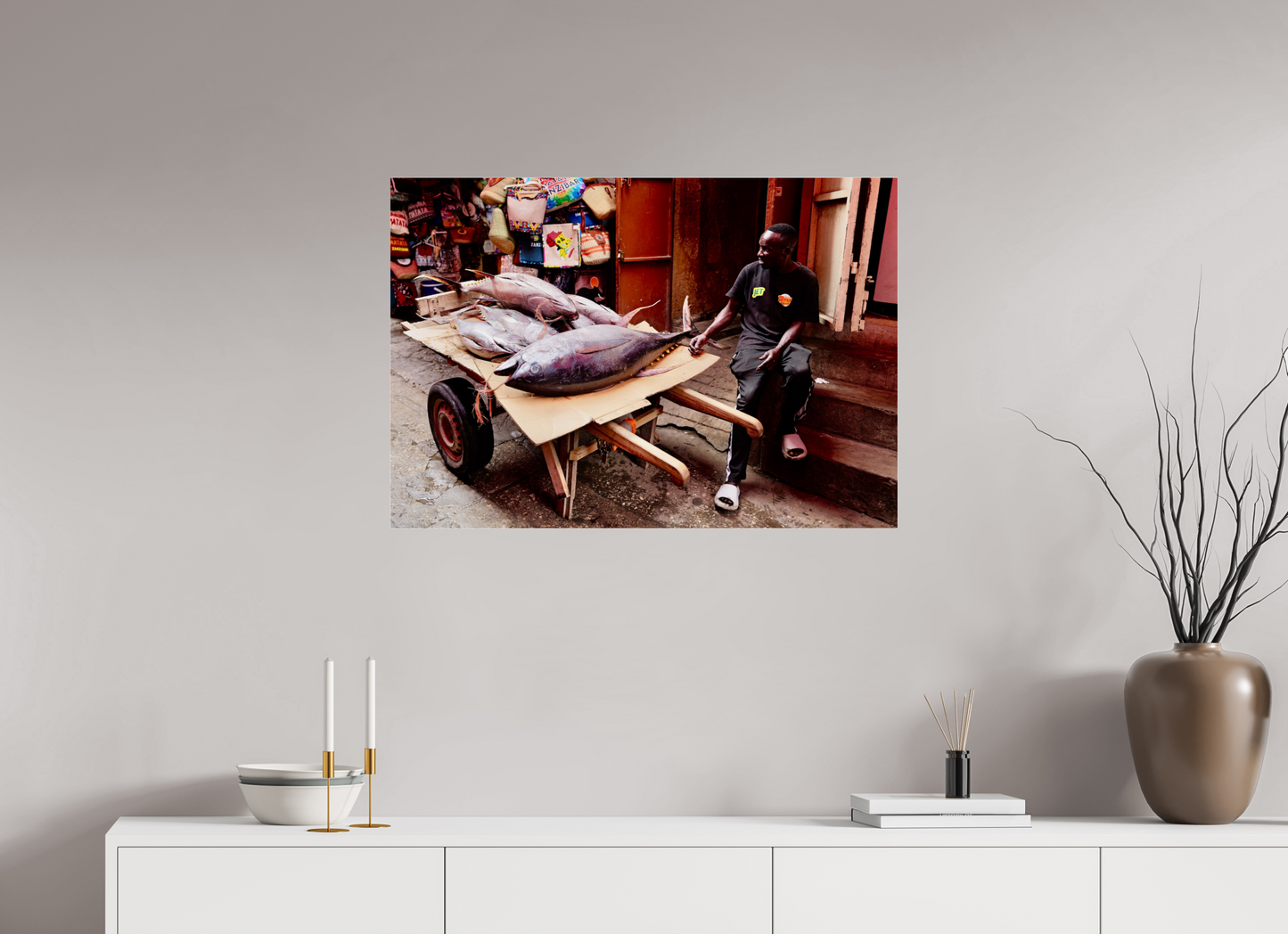 This photograph captures a moment in the value chain of deep-sea fishing: an artisanal moment in a globalized circuit . In Zanzibar, it is often coastal fishermen who provide the link between sea and market, in a context of increasing overfishing and environmental pressure .