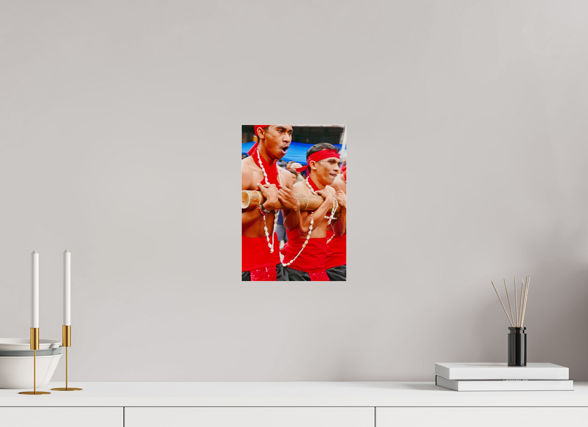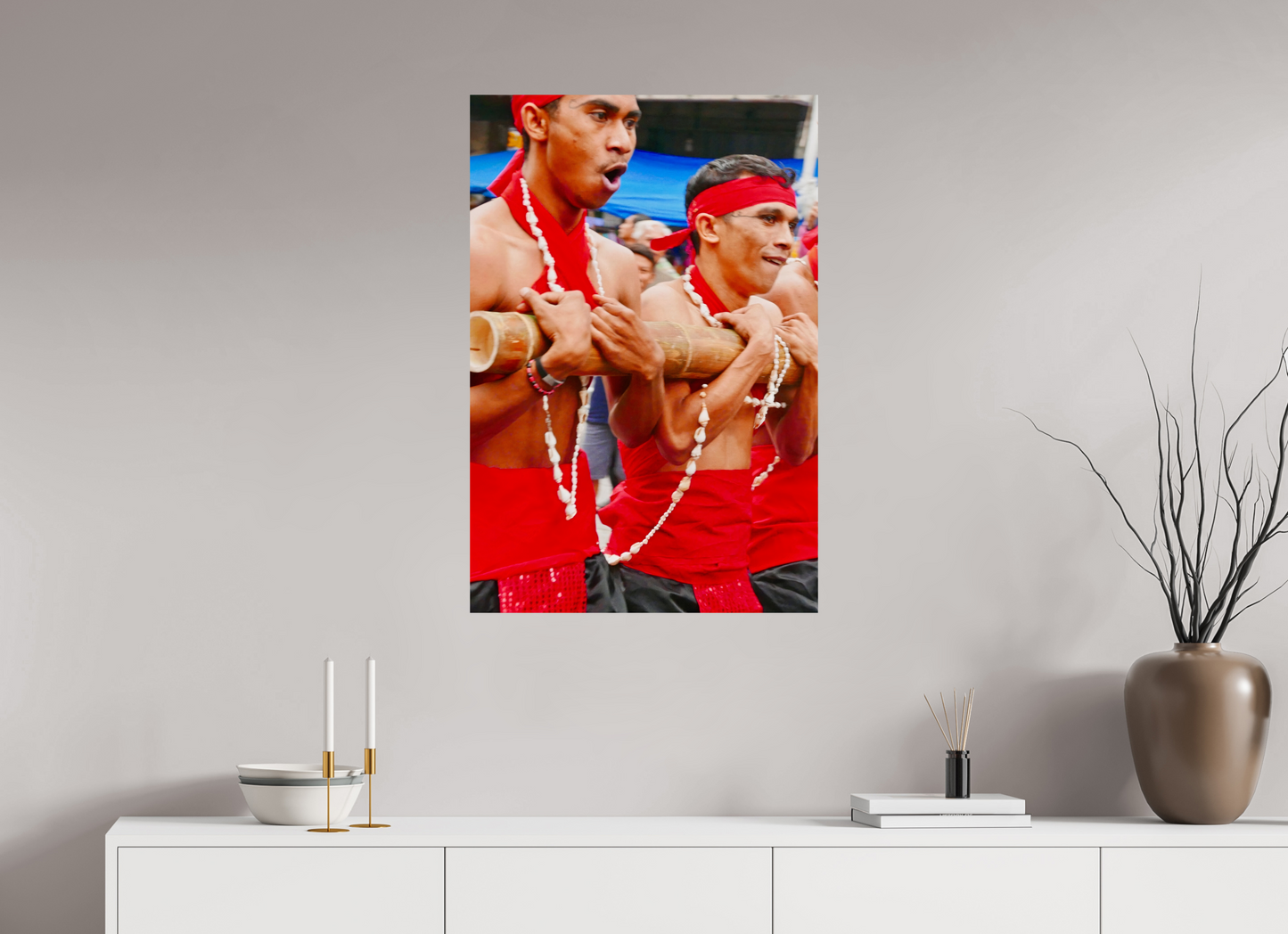 The men represented here carry a bamboo totem or palanquin , using a traditional shoulder-carrying technique, a mark of commitment and physical devotion . The bodily effort becomes a ritual offering , inseparable from the sacred value of the object carried.