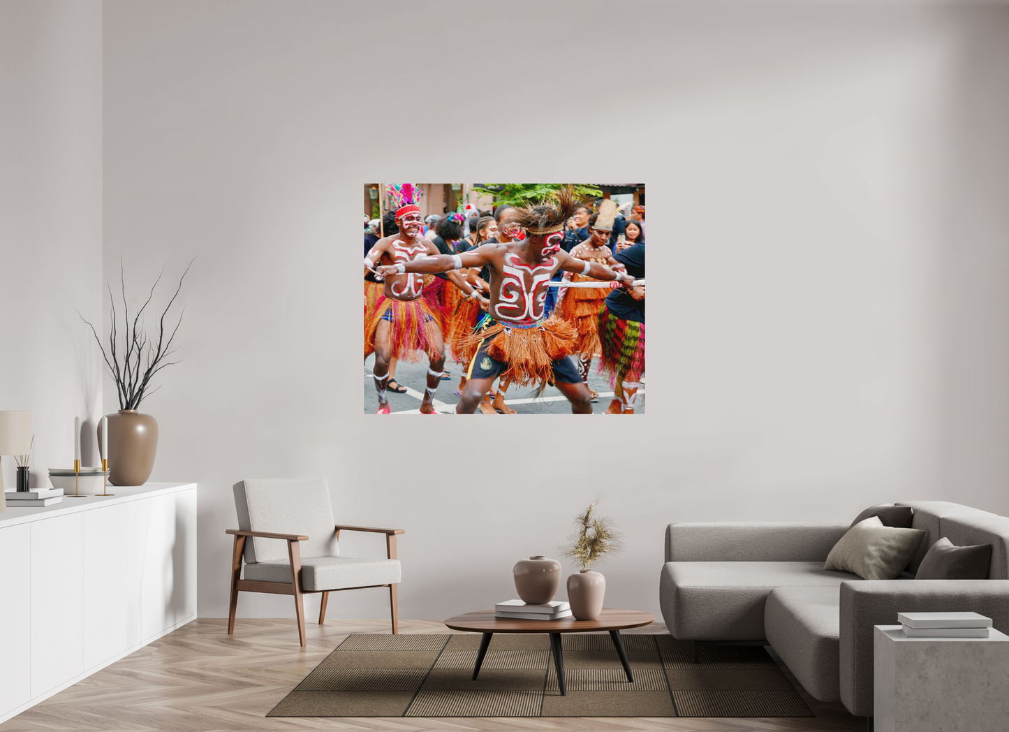 The war dances seen here come from the Papuan traditions of West Papua (Indonesia), a region located on the island of New Guinea. The body designs are made with natural pigments based on lime (white) and ochre (red), applied by hand or with a stick. The skirts are made from pandanus fibers or dried sago palm leaves.