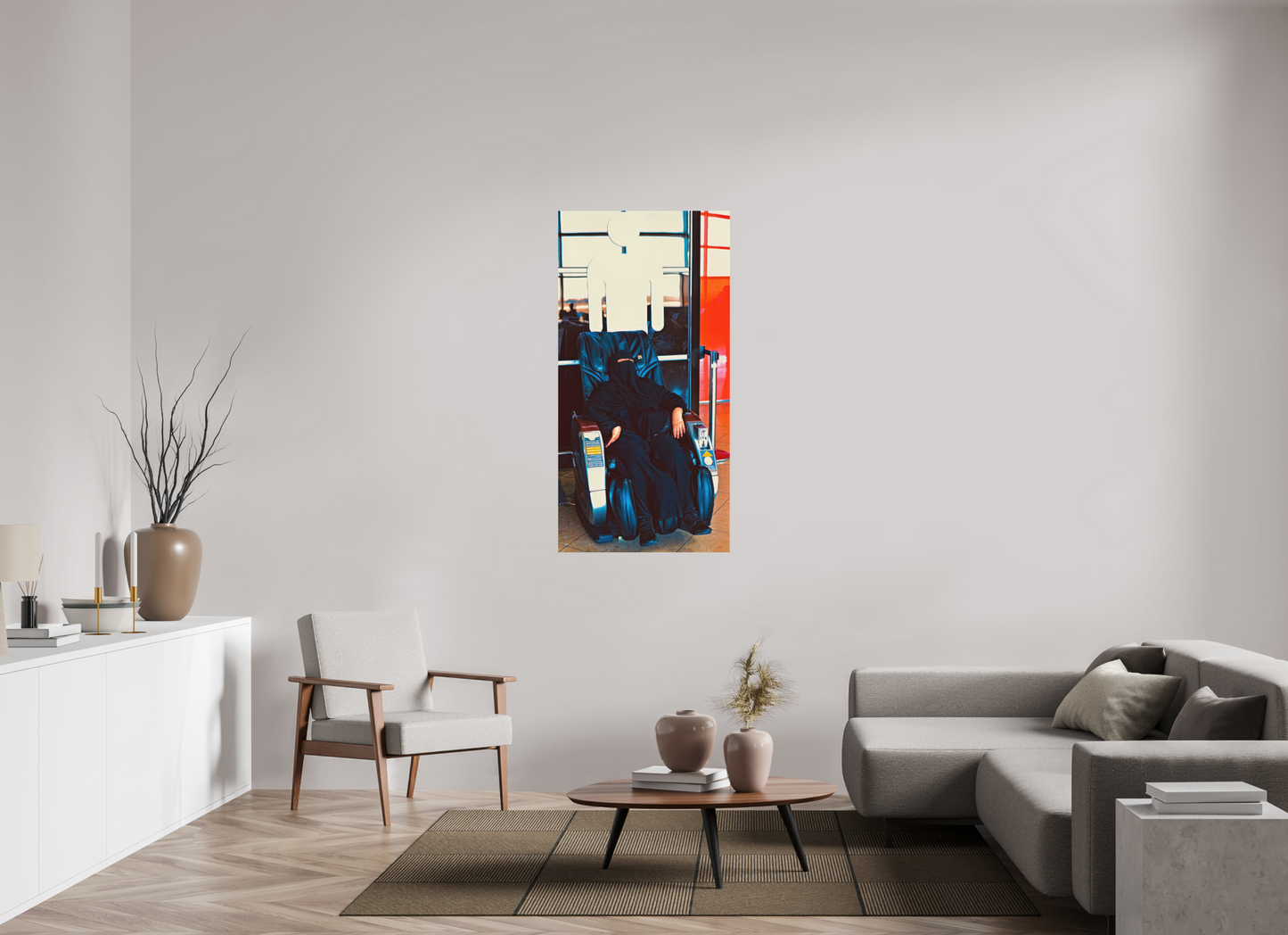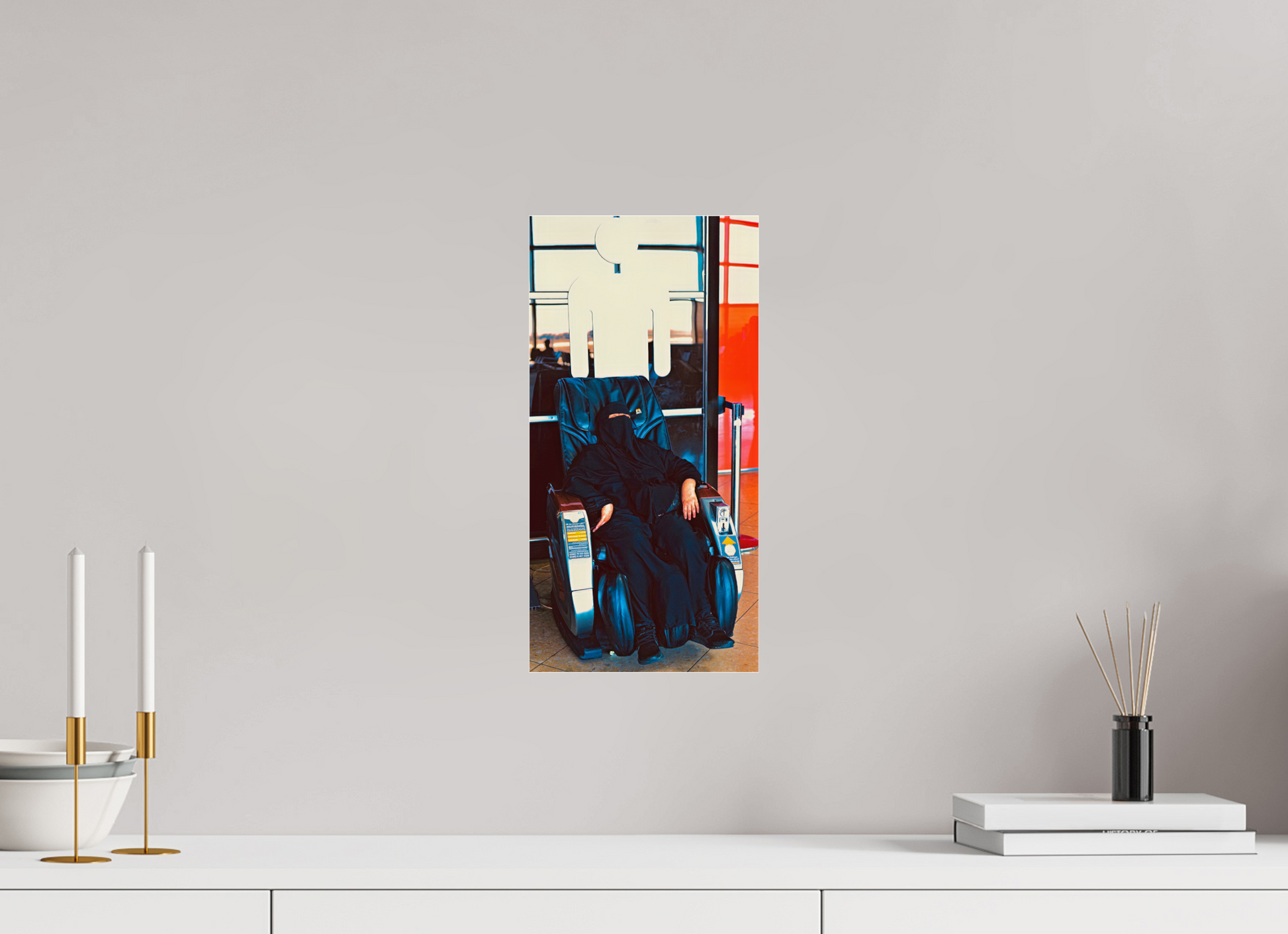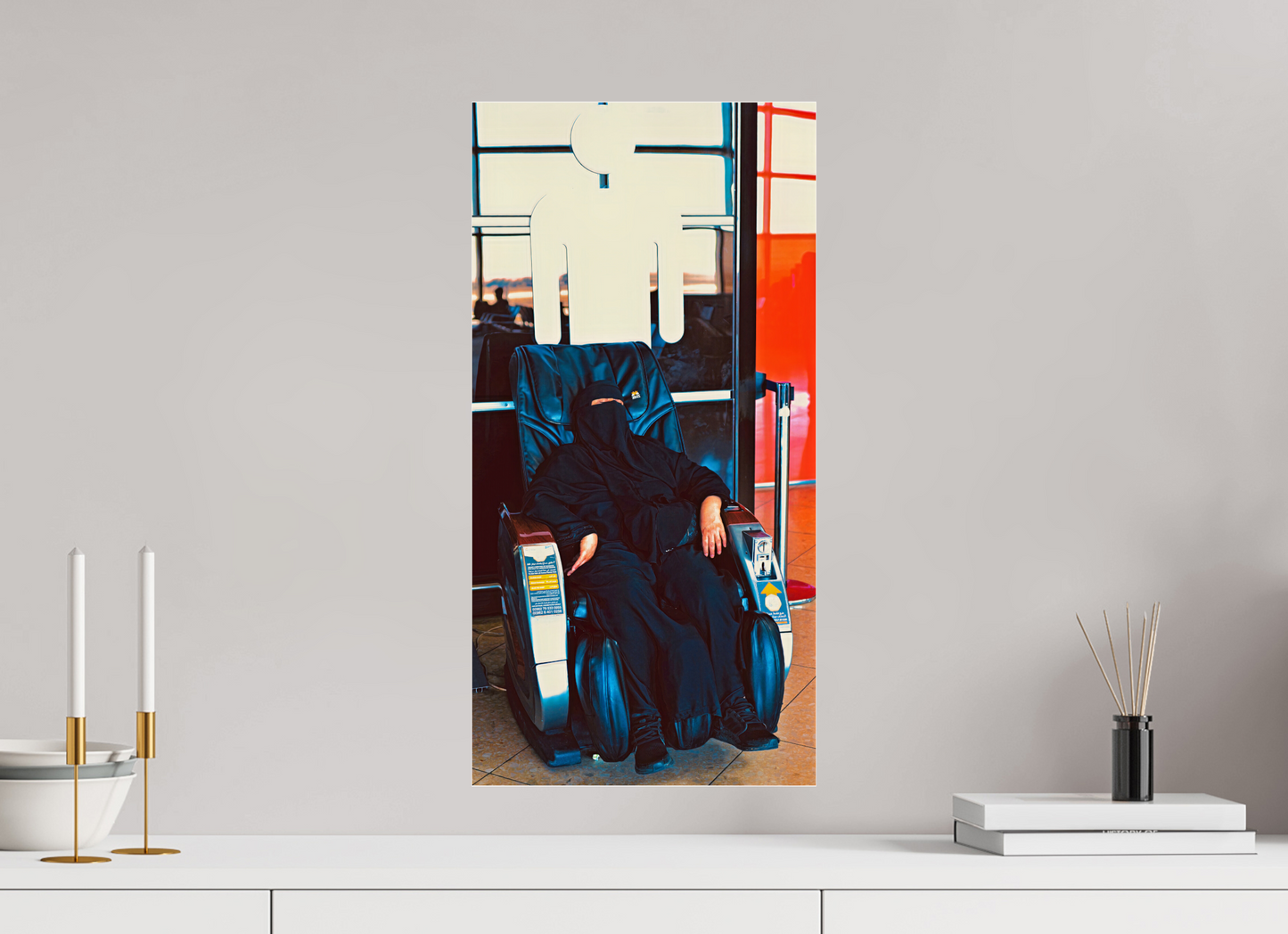 Beneath the white symbol of the men's restroom , a veiled woman surrenders to the calm of a massage chair . The visual irony is discreet but striking: the female figure, enveloped in shadow and fabric, is juxtaposed with the simplified, masculine icon of public space. In this suspended moment of transit , the contrast between the universality of signs and the individuality of presences reveals the complexity of cultural and social boundaries , while offering a nuanced and silent look at our spaces of passage.