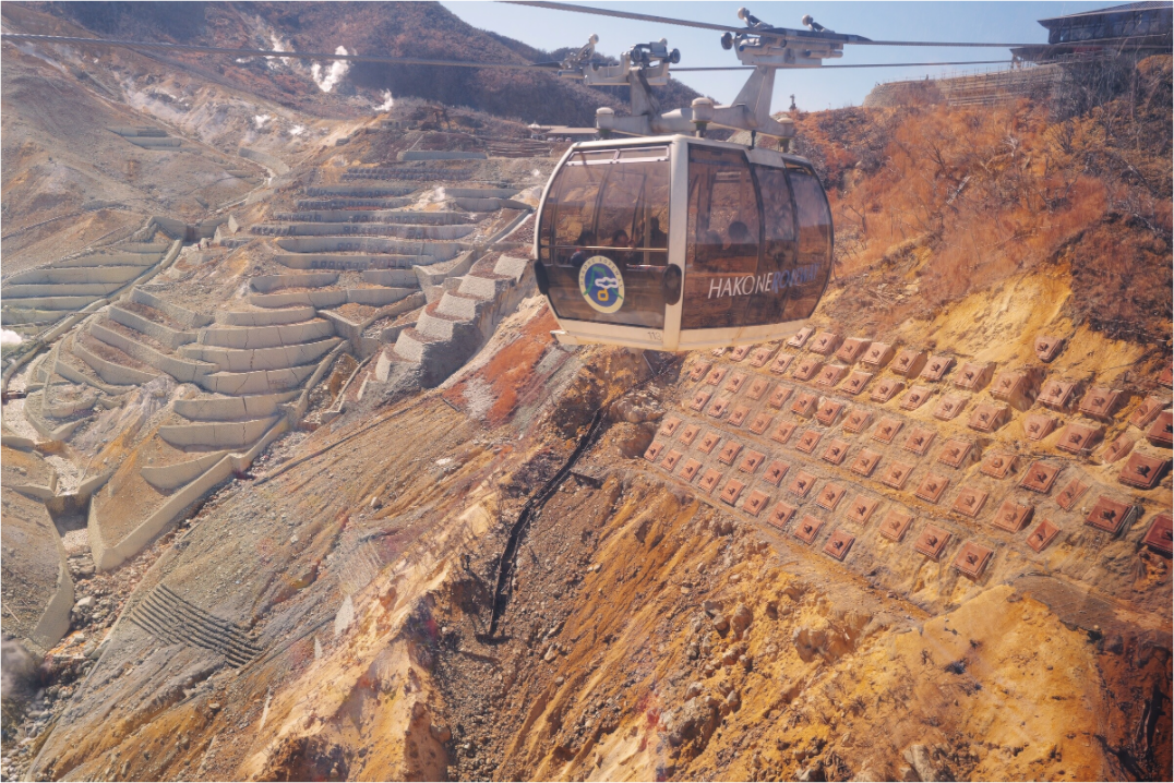 Located in the Hakone region, the Ōwakudani (大涌谷) volcanic valley was formed by the eruption of Mount Hakone nearly 3,000 years ago. This active geothermal area is known for its sulfur fumaroles , acidic hot springs, and spectacular mineral colors, due to high concentrations of sulfur dioxide, iron, and silica.