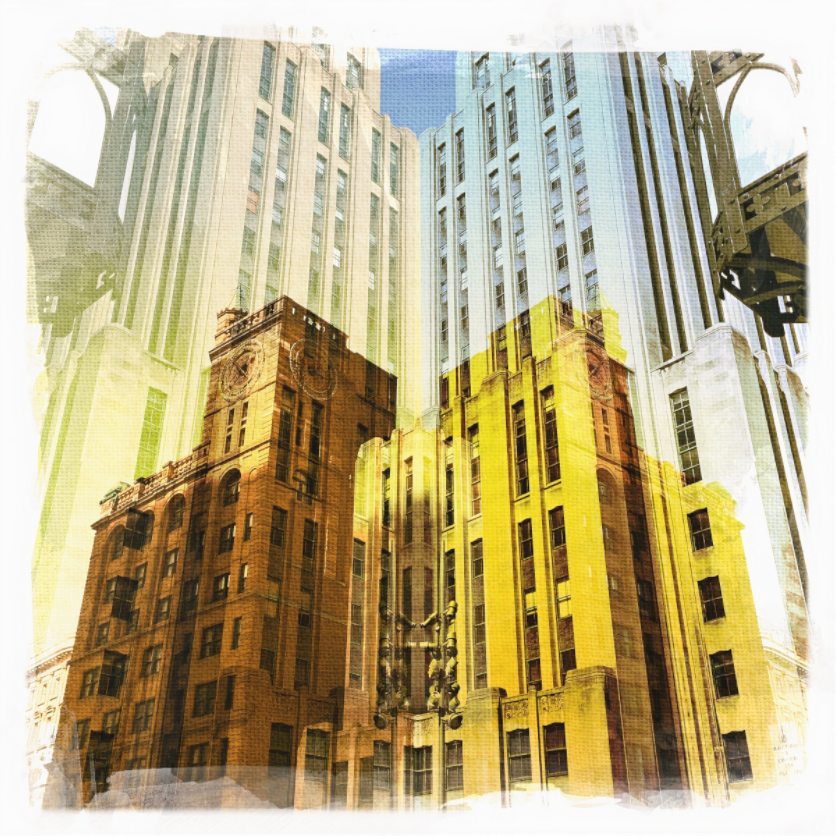In the Old Montreal district, the architecture plays on visual as well as temporal layers . This composition juxtaposes several of the city's landmark buildings, from the Art Deco and Neo-Gothic movements, dominant between 1920 and 1940. In the foreground, the Aldred Building , built in 1931 , illustrates this period of controlled verticality. Its design is directly inspired by the Empire State Building , but adapts its lines to the specific angle of Place d'Armes , creating an architectural prow effect.