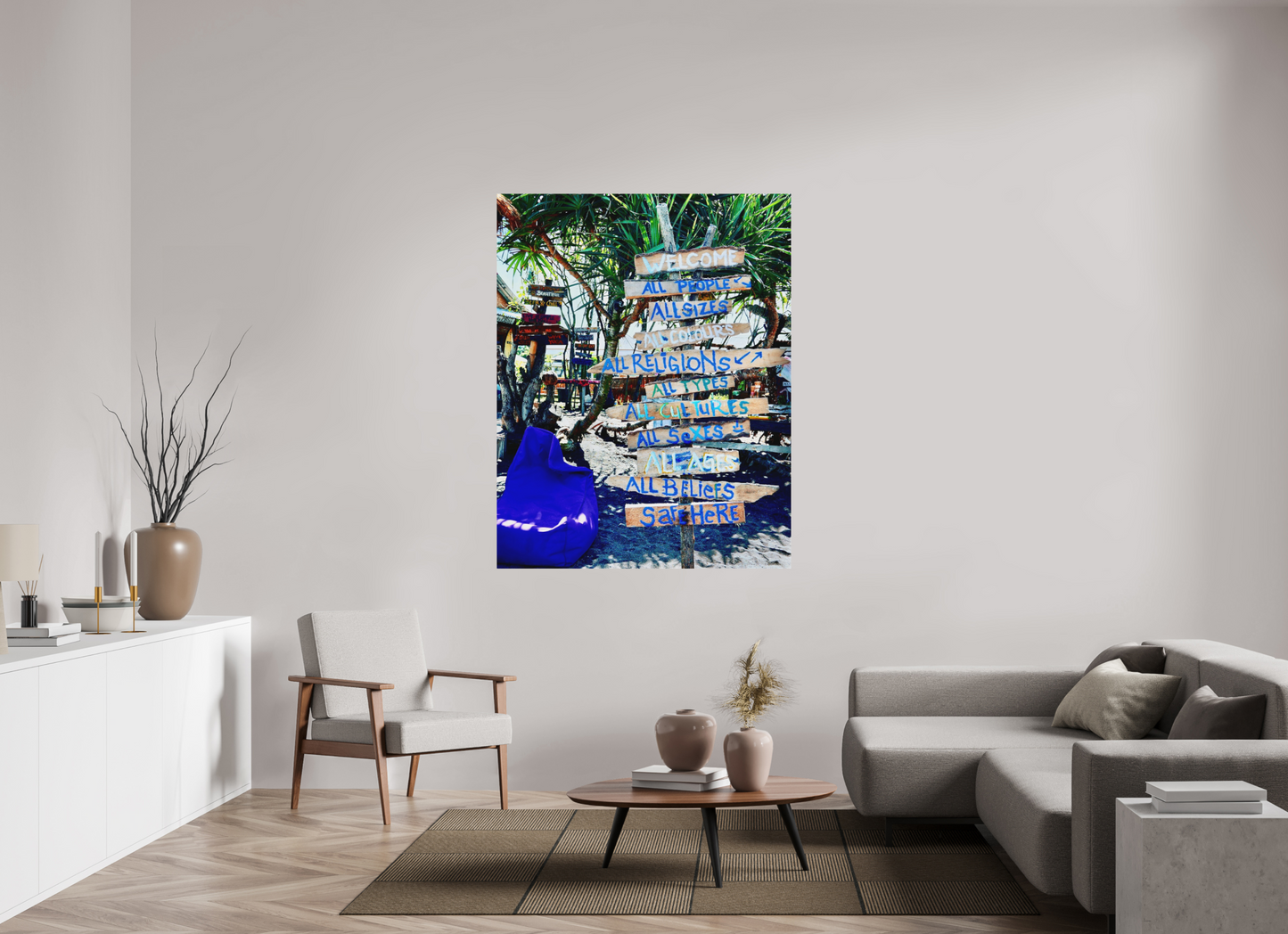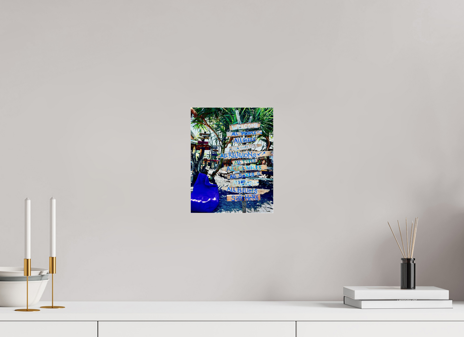 This painted wooden signage , placed at the entrance to an alternative beach café , reflects a dual dynamic specific to Bali: on the one hand, a real tradition of ritual and community hospitality ; on the other, visual marketing inspired by globalized multicultural and queer-friendly codes.
