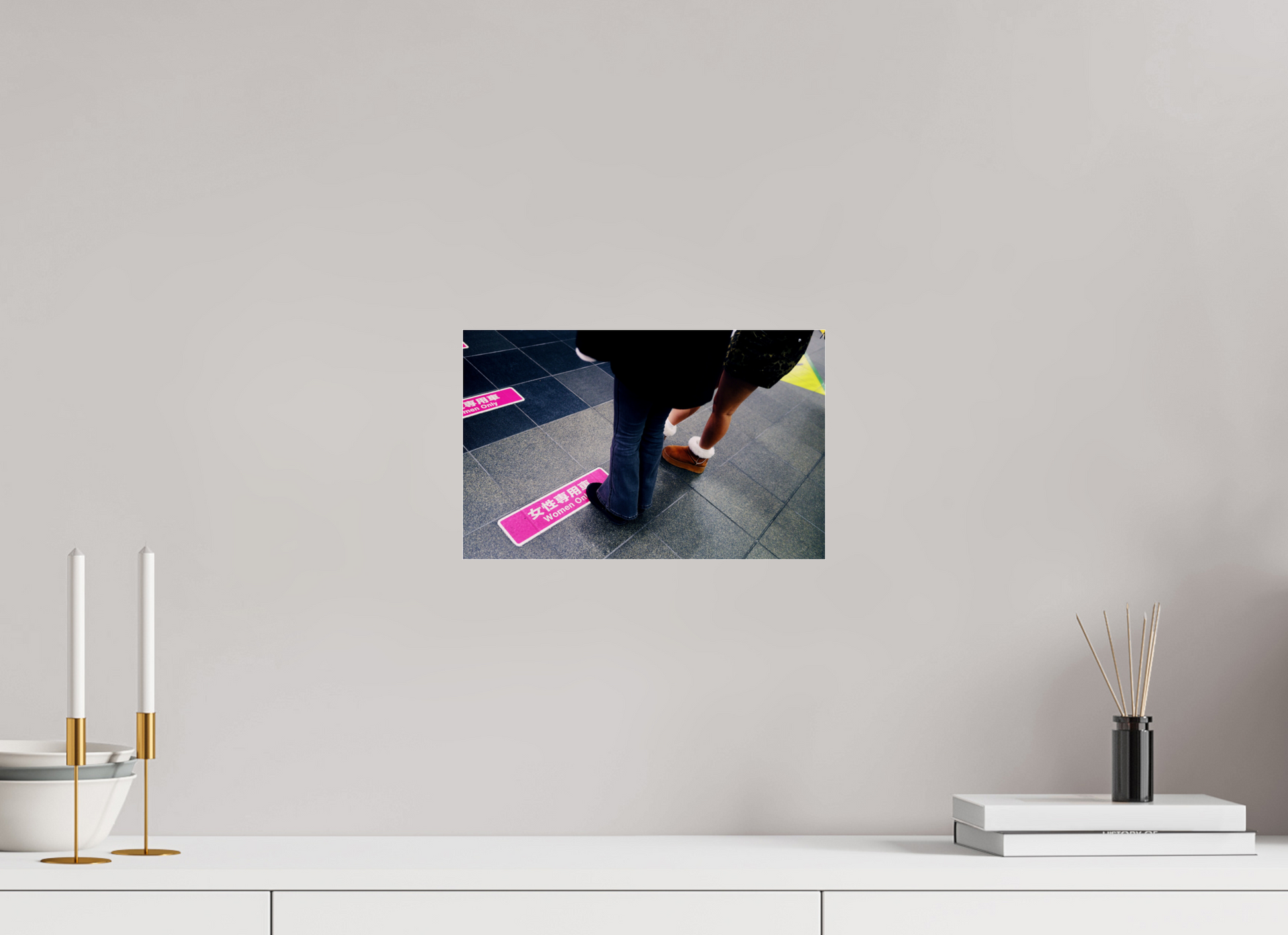 On the smooth tiled floor of a Japanese train station, these pink “Women Only” (女性専用車) markings indicate access to women-only carriages . Implemented in the 2000s in Japan, this measure aims to combat the persistent phenomenon of groping on public transport , particularly during rush hour. It guarantees a protected space , designed for the safety and tranquility of female passengers, and marks a gender-specific consideration of subway use.