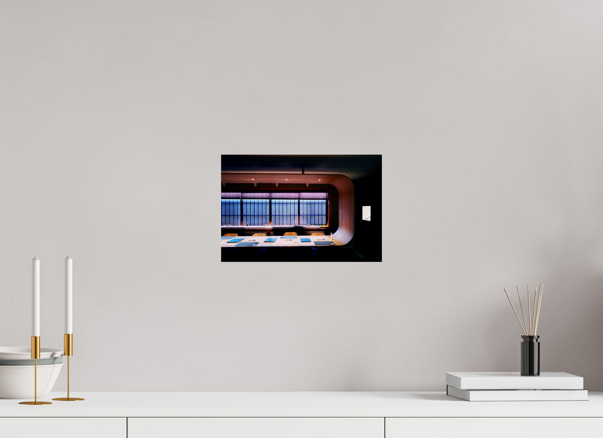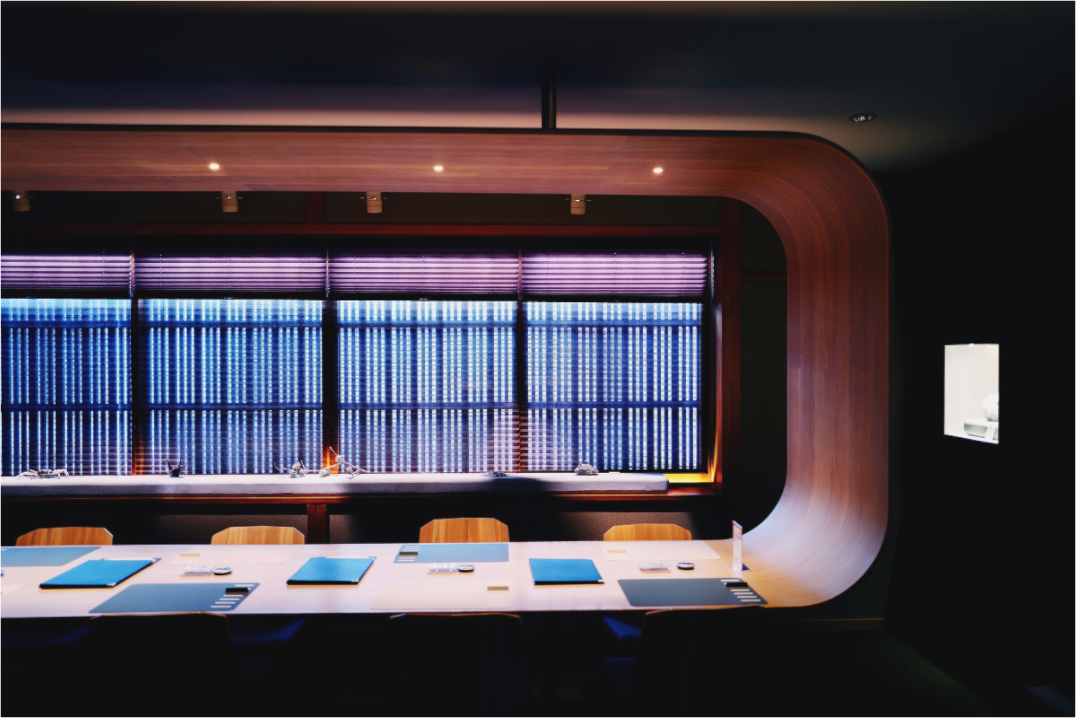 L’accueil au Japon ne s’improvise pas, il se sculpte dans l’espace. Cette salle en est l’illustration : minimaliste mais jamais froide, géométrique sans rigidité. Le bois courbé ne sert pas seulement à adoucir les lignes, il inspire la fluidité des gestes ; les sets de table alignés évoquent l’omotenashi (おもてなし), cette hospitalité japonaise empreinte de discrétion, d’attention à l’autre, et de non-dits.